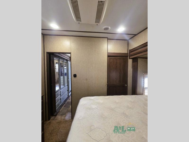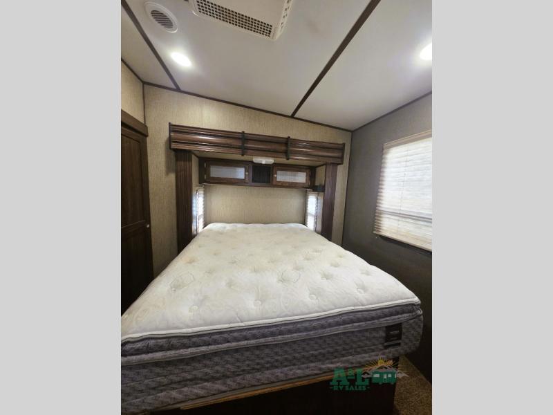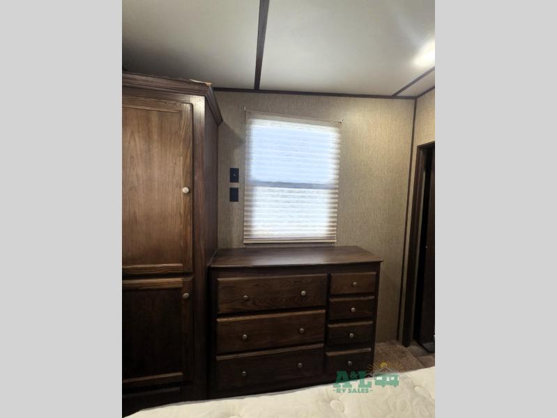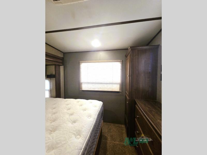 The master bedroom features a quiet retreat away from it all where you can enjoy a slide out residential queen size bed, dresser, cabinet, and overhead storage. Remember there is more wardrobe storage directly across from the bathroom.