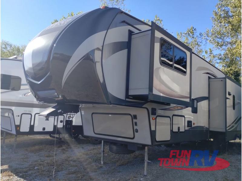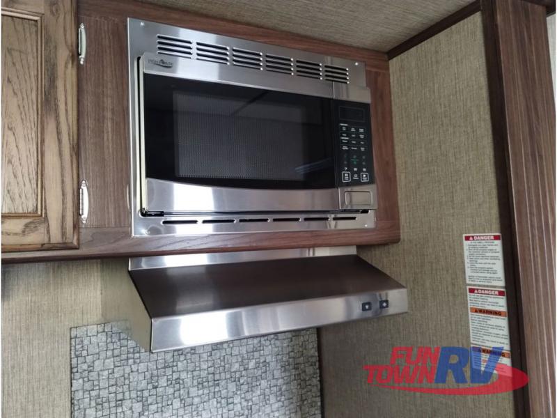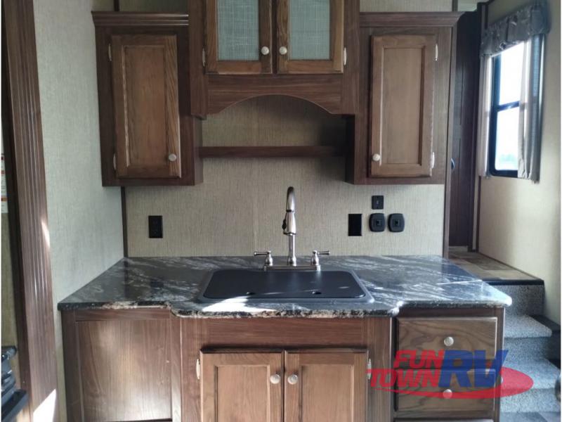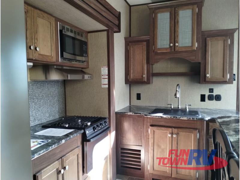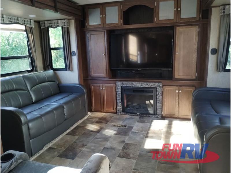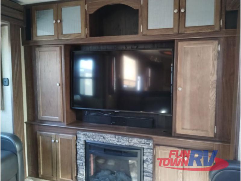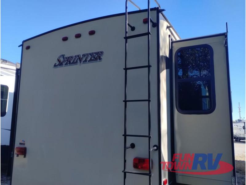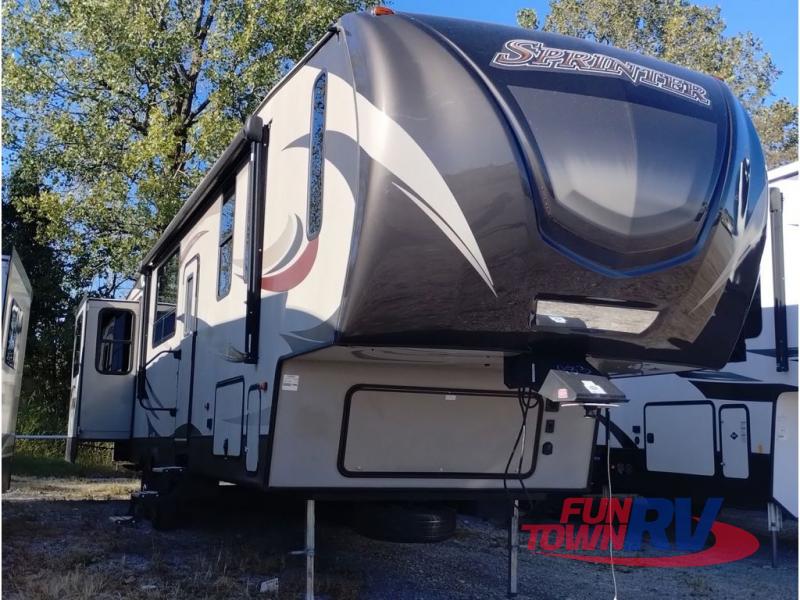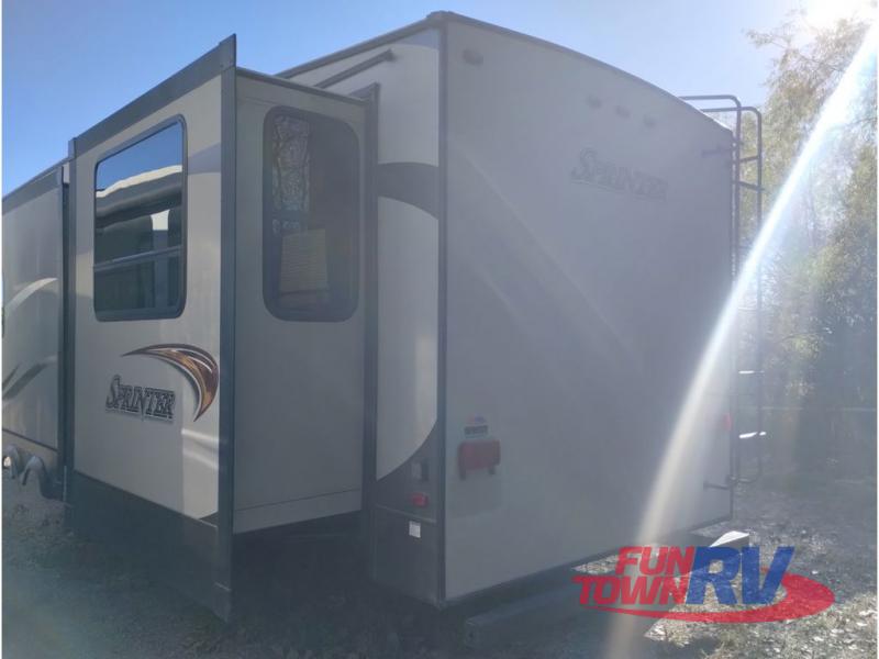 This Keystone Sprinter fifth wheel features a wide body design with quadruple slides which increases the size even more when all slides are fully extended. You are sure to love the den area with the rear entertainment center and fireplace.
