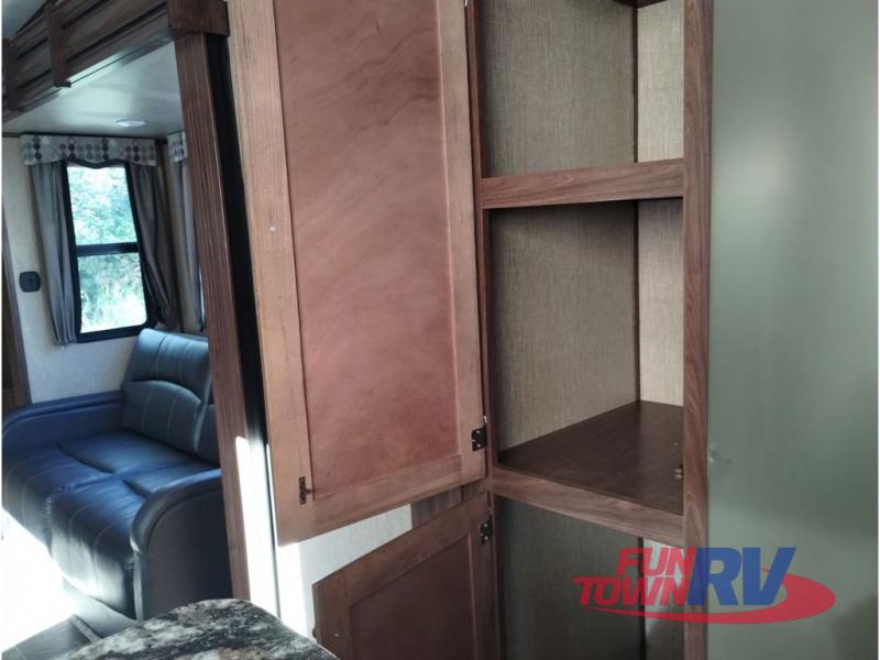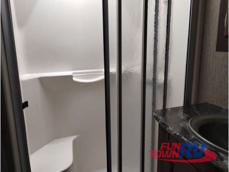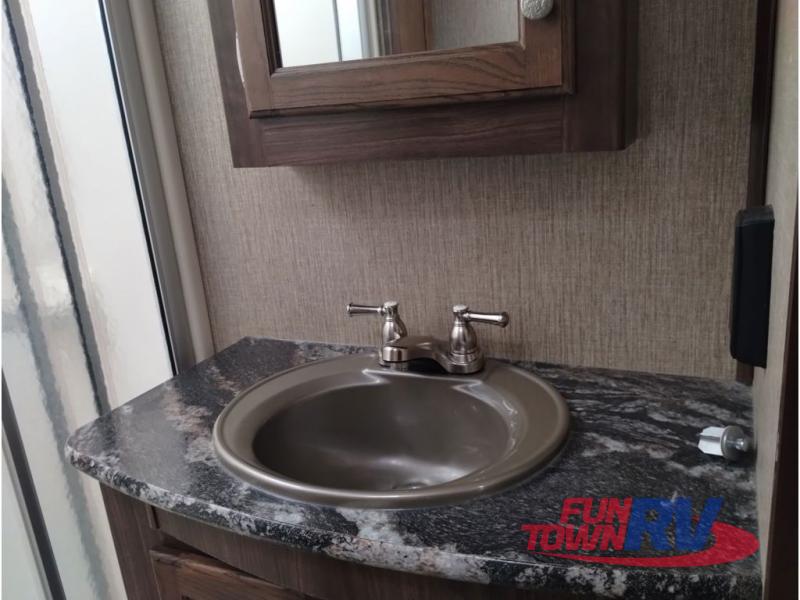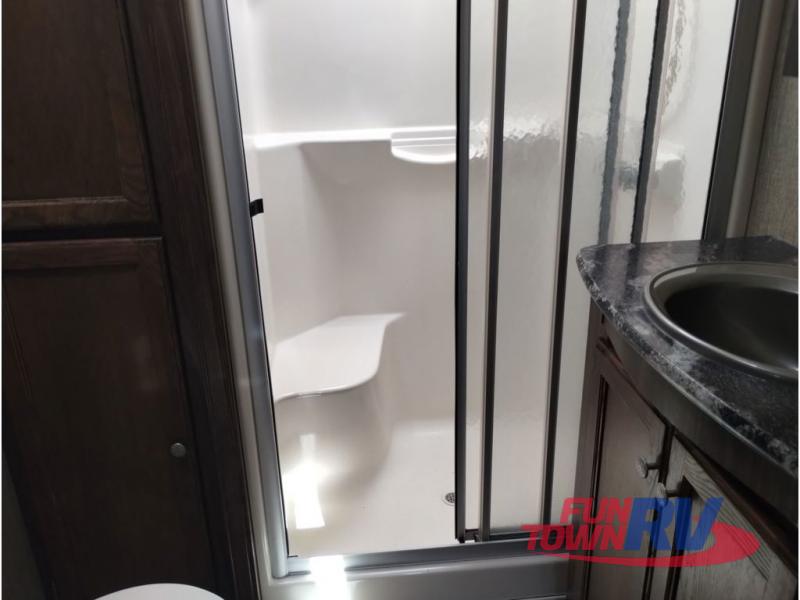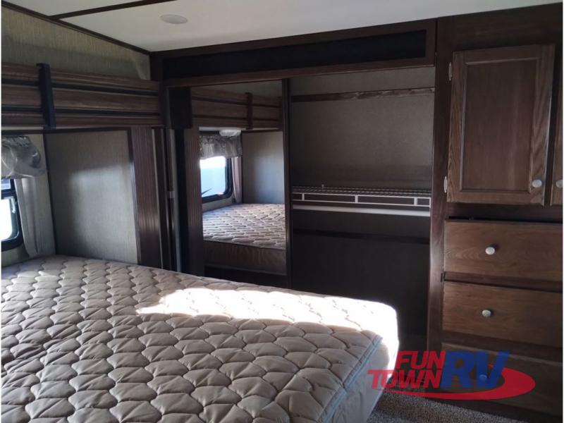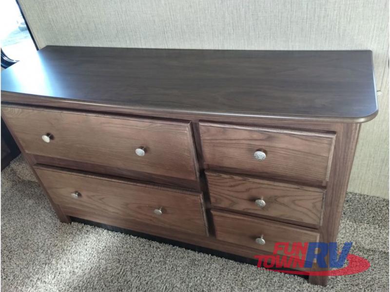 Enter model 353FWDEN and head up the steps on your right to the front master bedroom and side aisle bath. The bathroom offers a residential shower, toilet, sink, and linen cabinet. The private master bedroom at the end of the hall features a slide out residential queen size bed. There is also a dresser opposite, and full front wall wardrobe and closet prepped for a washer/dryer for all of your clothing storage needs.