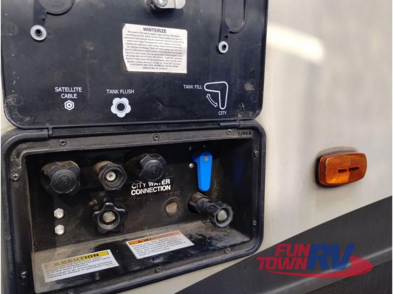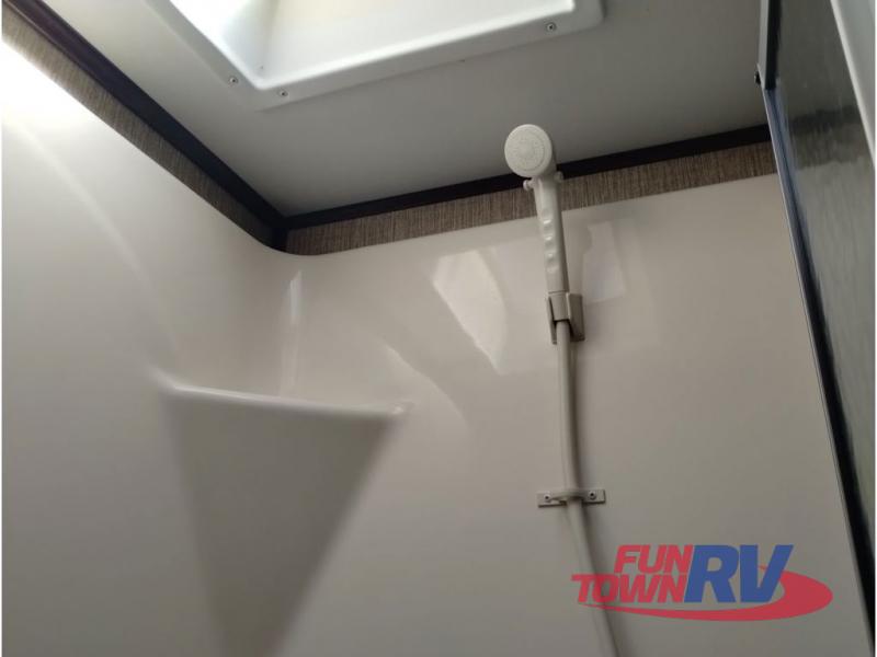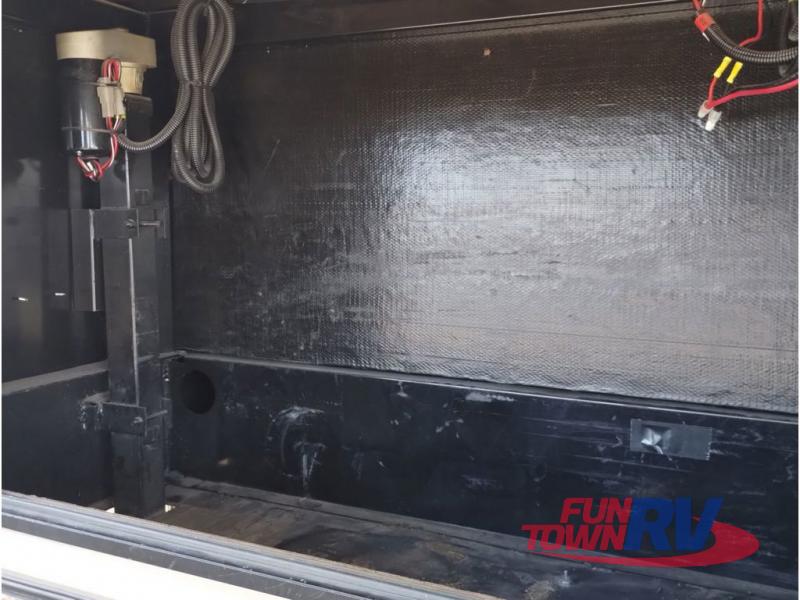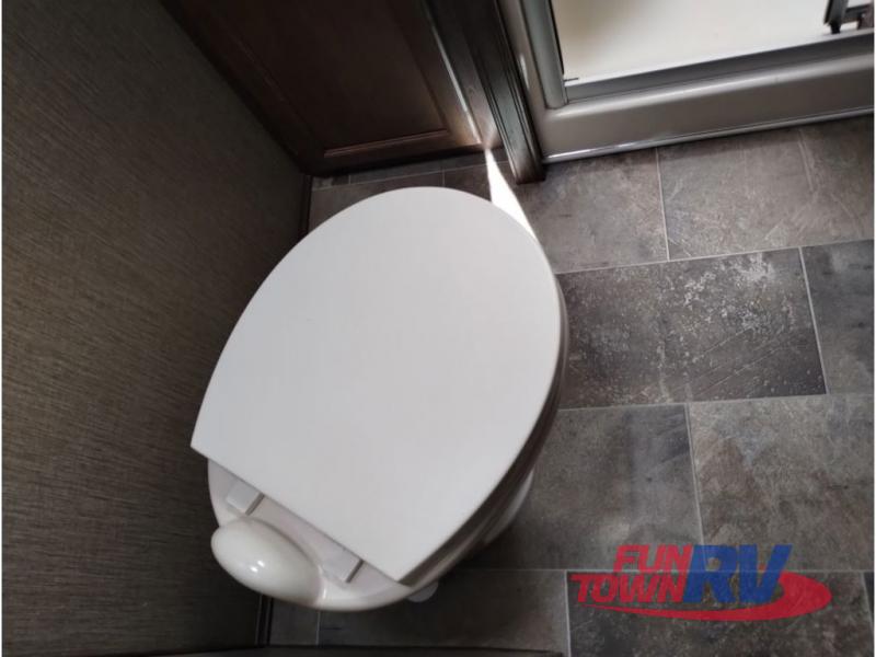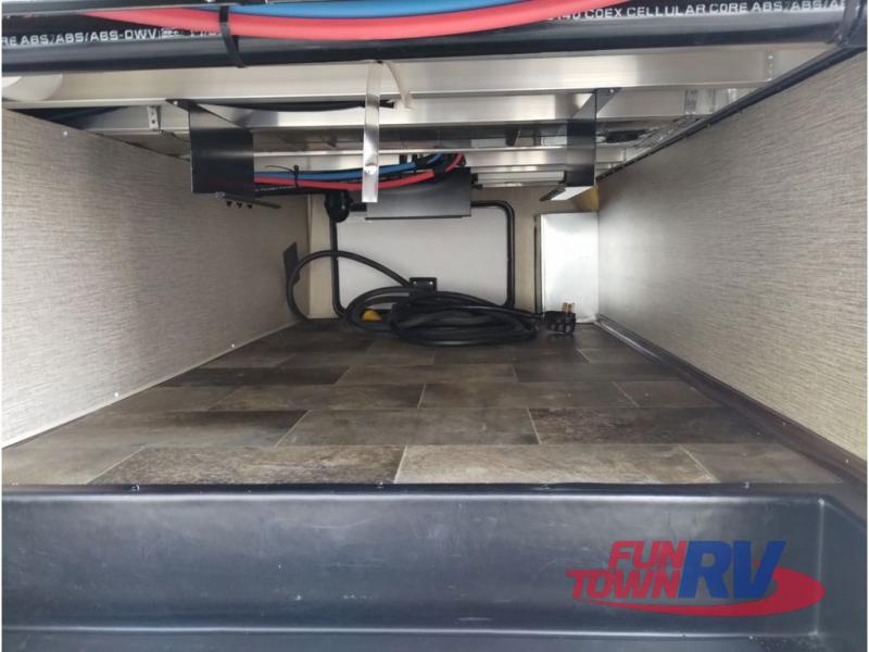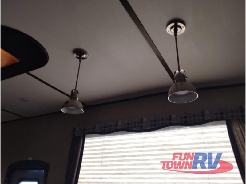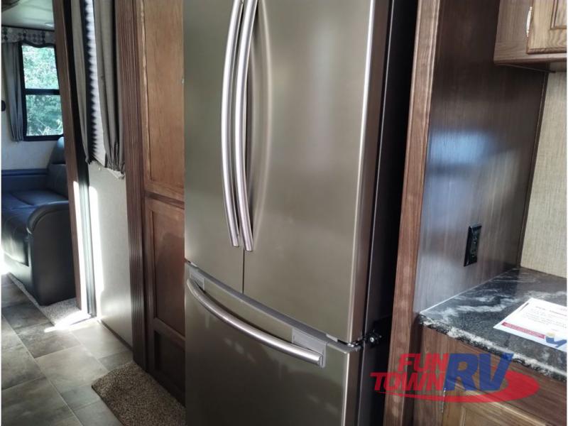 Enter model 353FWDEN and head up the steps on your right to the front master bedroom and side aisle bath. The bathroom offers a residential shower, toilet, sink, and linen cabinet. The private master bedroom at the end of the hall features a slide out residential queen size bed. There is also a dresser opposite, and full front wall wardrobe and closet prepped for a washer/dryer for all of your clothing storage needs.