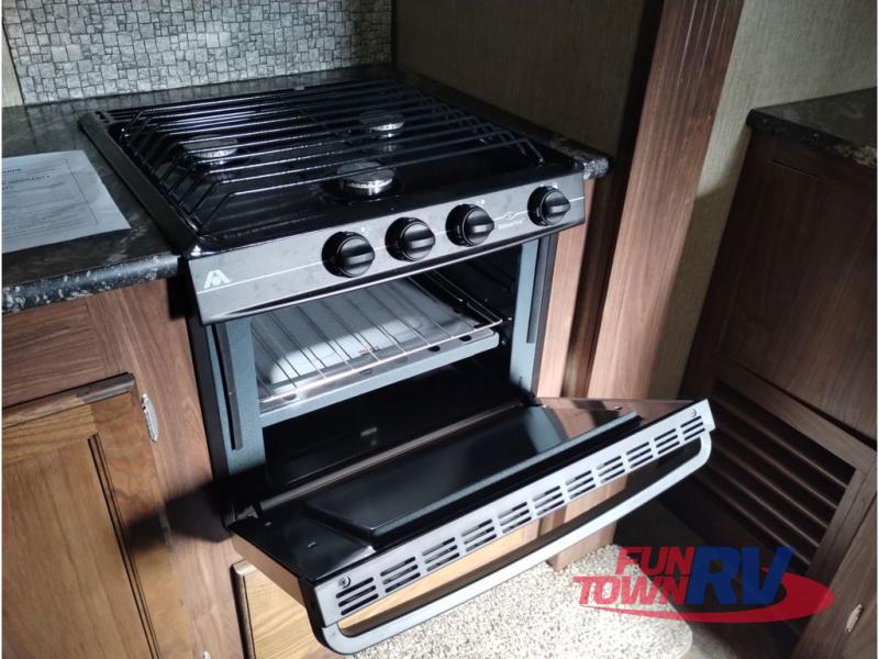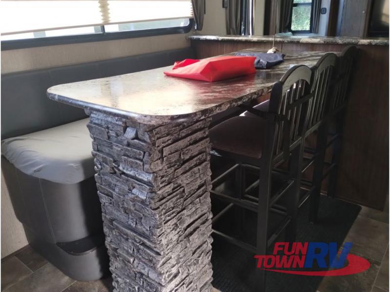 Heading towards the kitchen area you will find a dinette with booth seating along the curb side wall and three chairs on the opposite side. Along the interior wall find a kitchen sink with counter space on both sides plus overhead storage for your dishes and things. The kitchen continues to provide everything you need to prepare and cook food for your family including a slide out three burner range, an 18 cu. ft. residential refrigerator, and a pantry for your non-perishables.