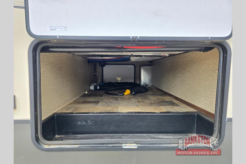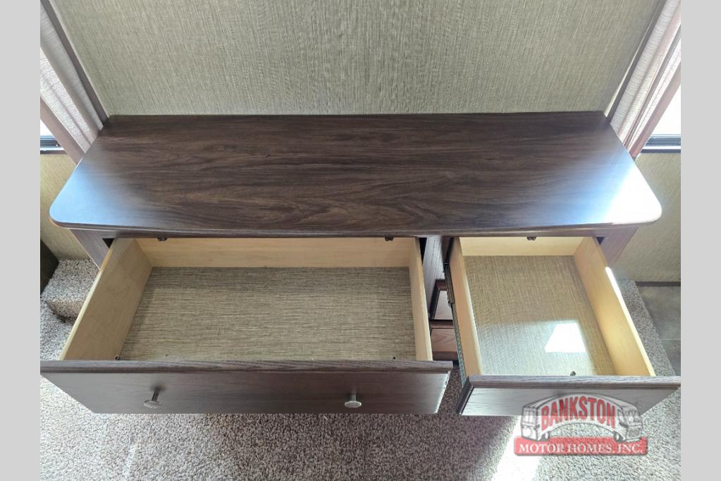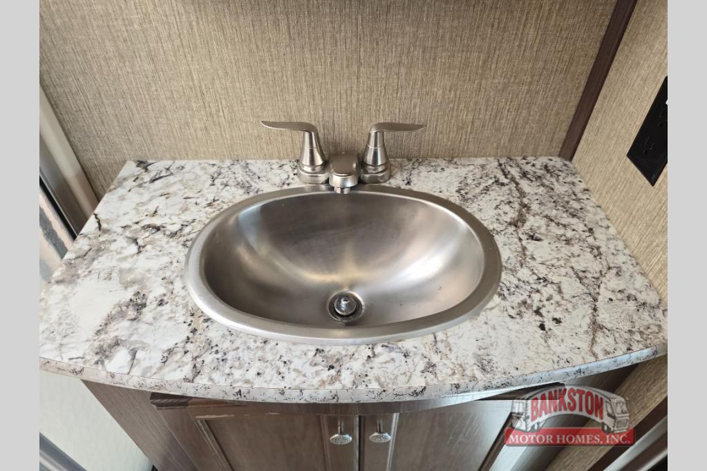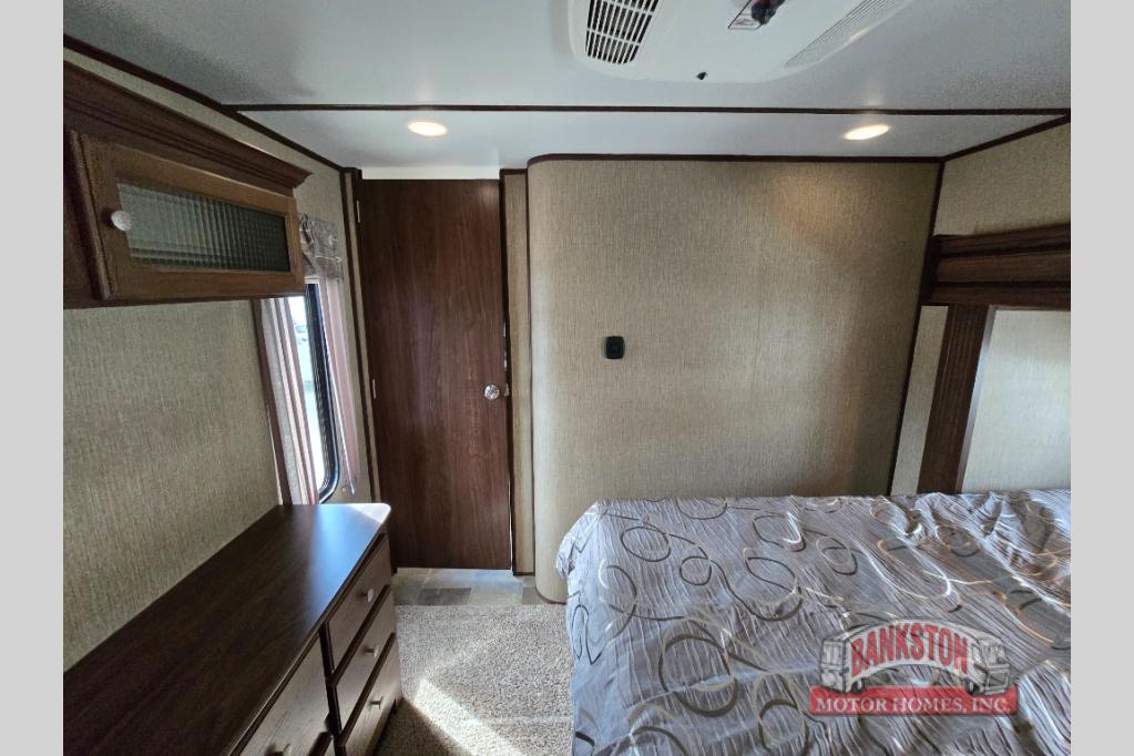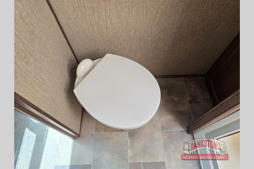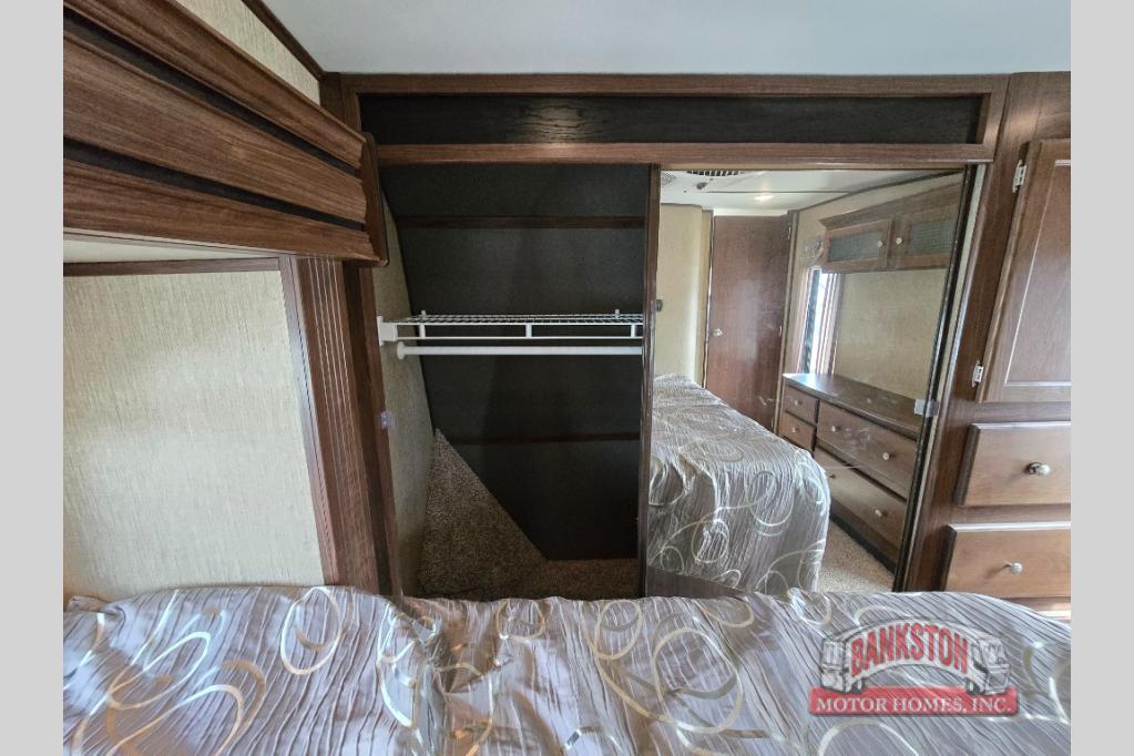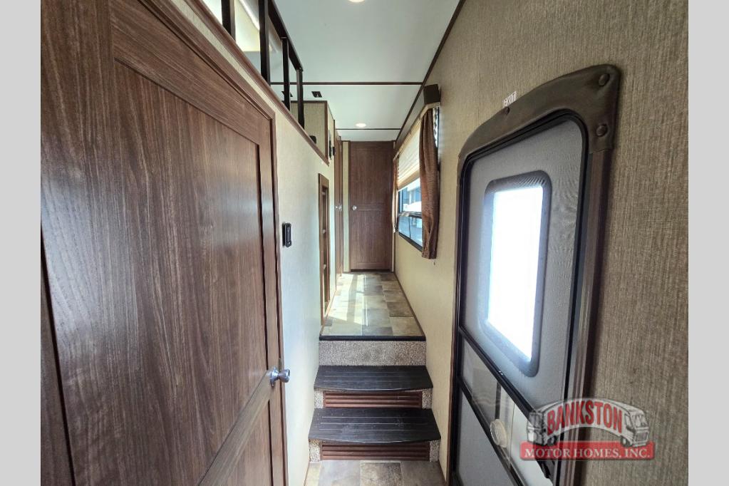 Up the steps to your right through the same entry door you will find a bathroom through the first door on your left. Inside enjoy the convenience of a residential shower, toilet, and sink. There is also a linen cabinet for your towels and other bath products. At the head of the hall find a spacious master bedroom featuring a slide out queen size residential bed, a dresser opposite along the curb side wall, and a front wardrobe for your clothing. There is also a second closet along the front that features a space prepped for a washer and dryer if you choose to add the appliances.