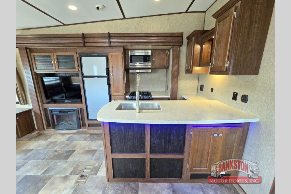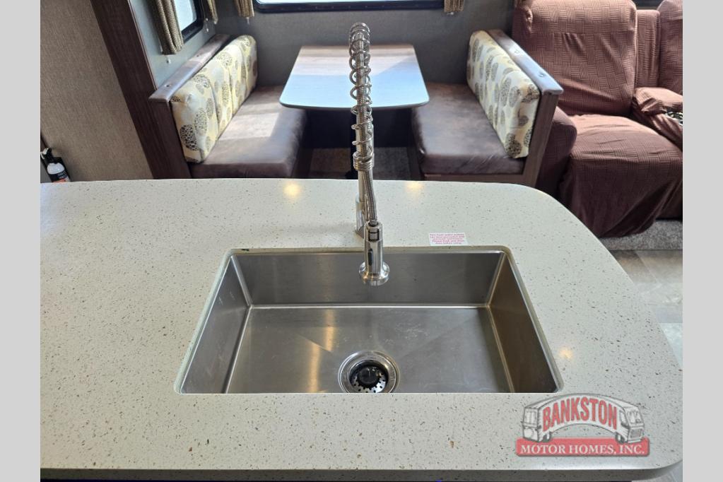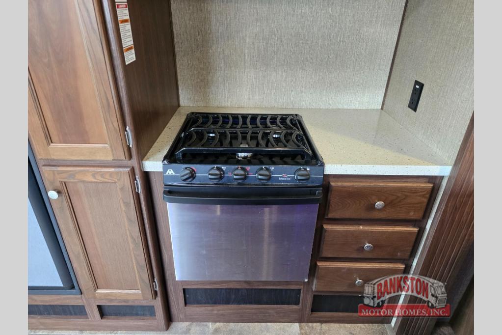 Back at the entry turn left and enter a spacious combined rear living area and kitchen. The kitchen space is closest to the door with a slide out dinette and theatre seat to your immediate left. Along the interior wall you will find a counter peninsula with a large sink, and storage. Along the road side a slide out three burner range, pantry, and refrigerator will allow you to easily cook meals and snacks for your family. This all sits nicely with the entertainment center and 40" HDTV.