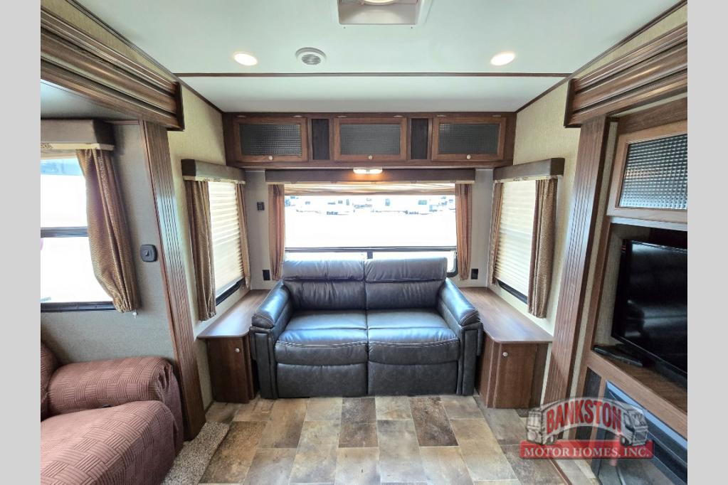 Along the rear wall enjoy a tri-fold sleeper sofa with end tables on either side. From here you can enjoy conversation with family or friends, or you can easily view the TV. This easily creates added sleeping space if needed, plus so much more!