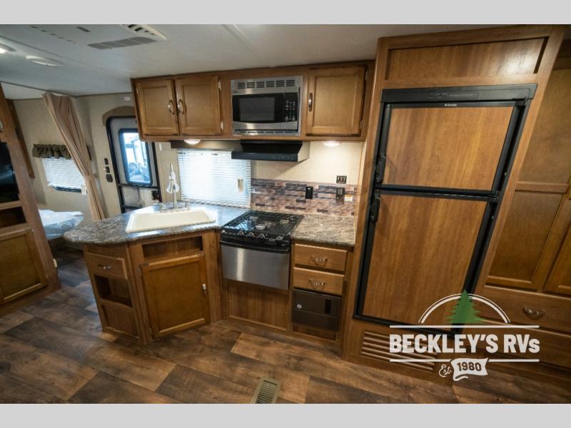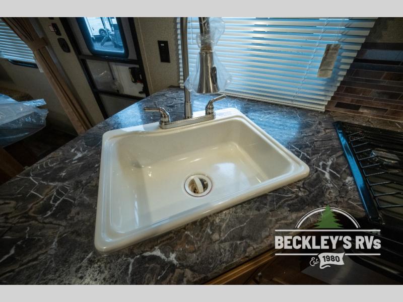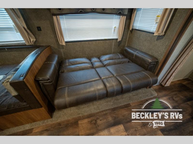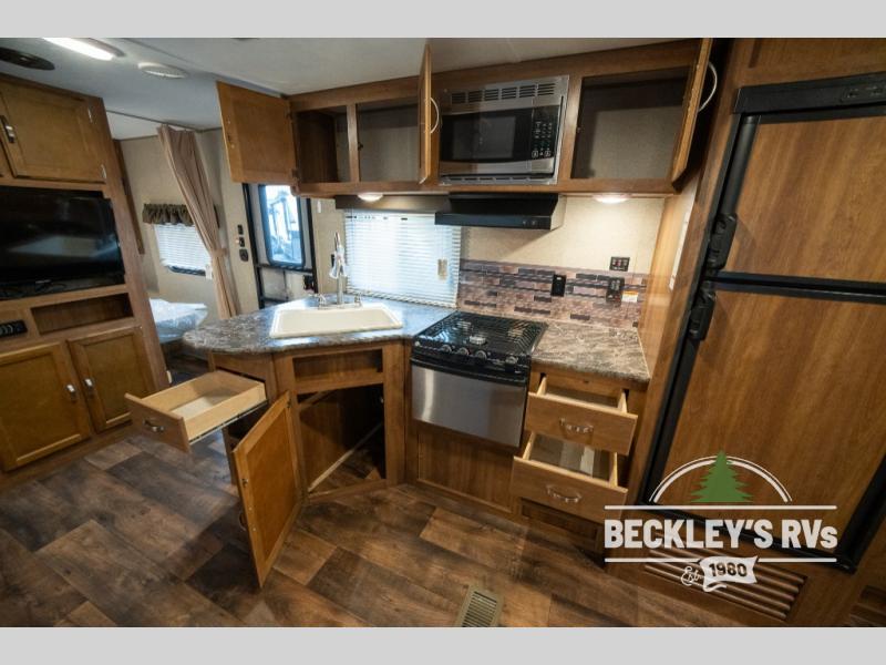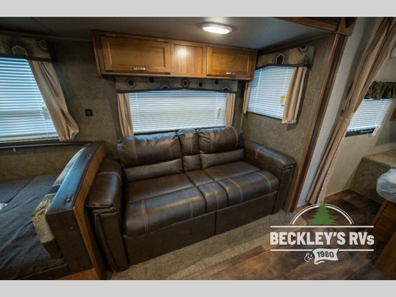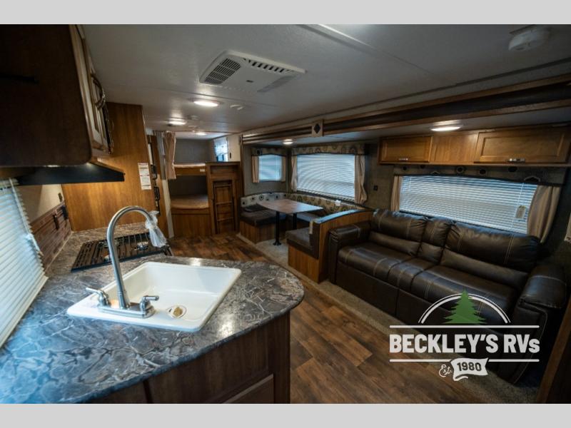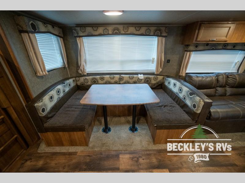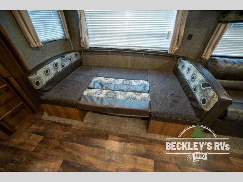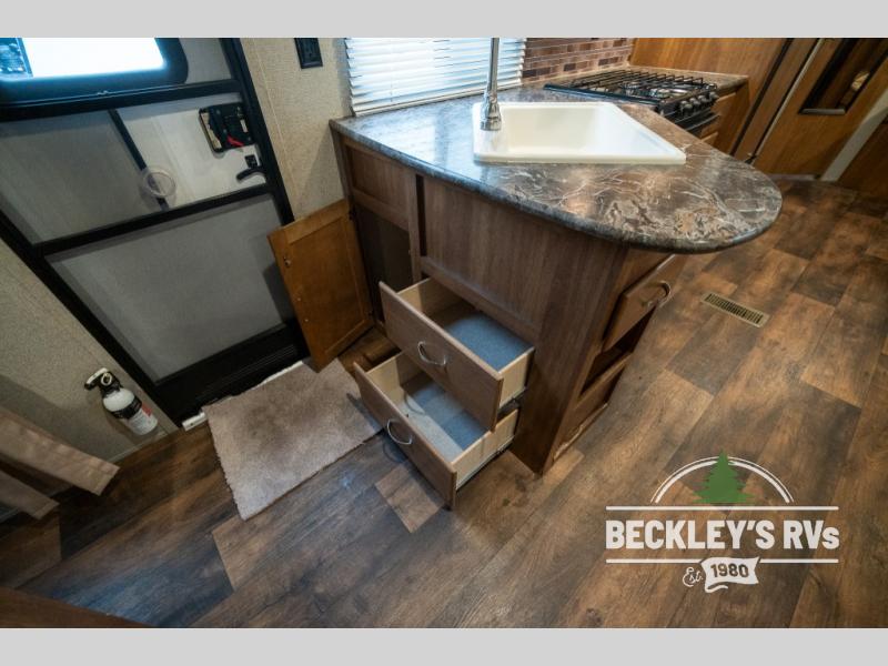 Step into the main entry and see just how spacious the combined kitchen and living area thanks to the slide out along the road side. Within the slide out you will find a jack knife sofa with an overhead cabinet, and a u-shaped dinette.