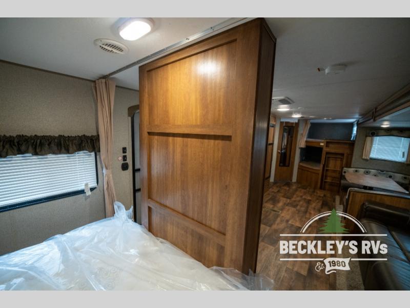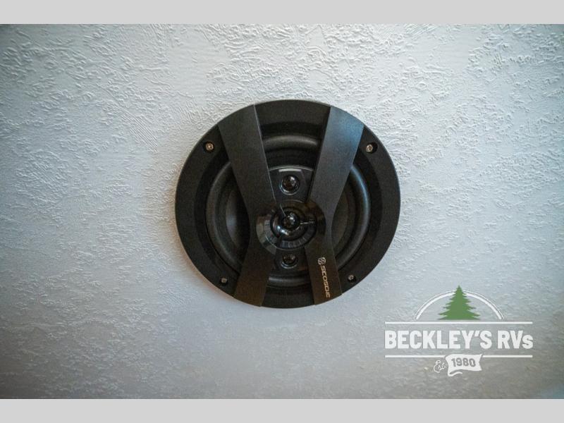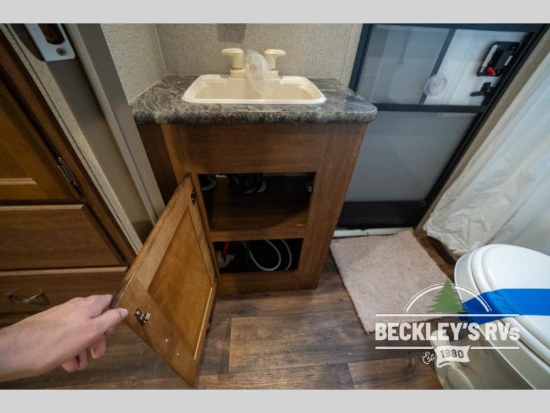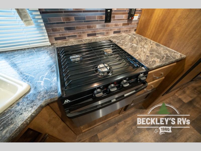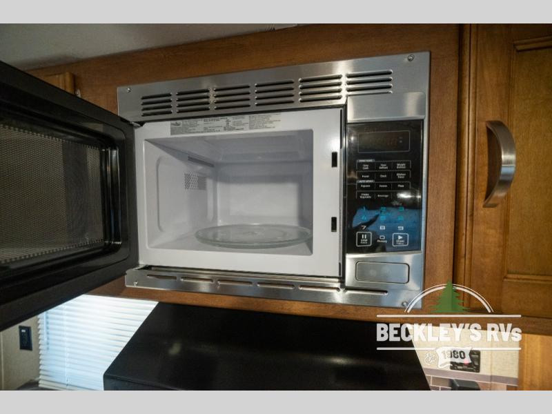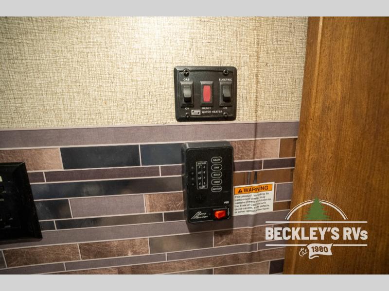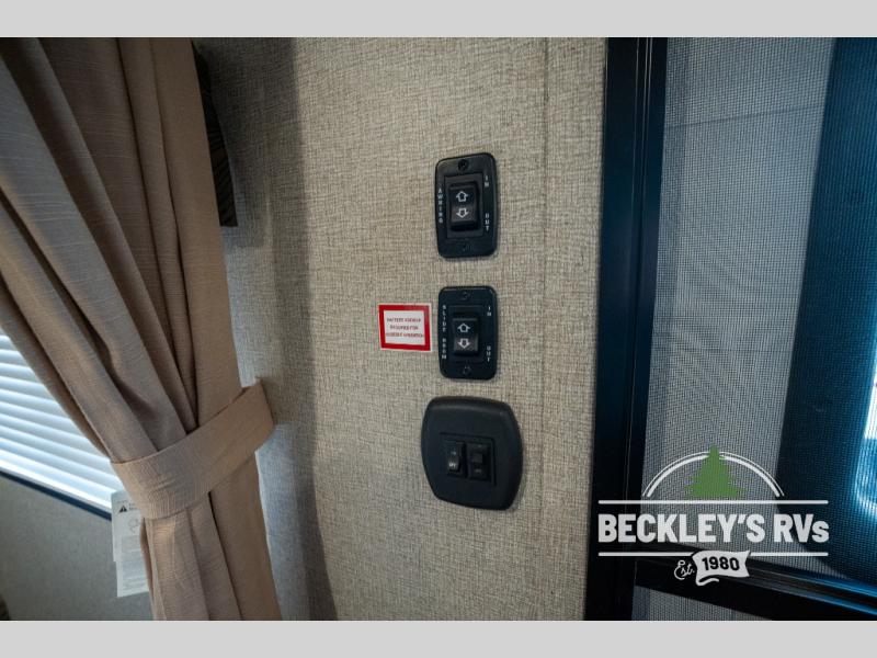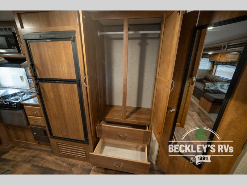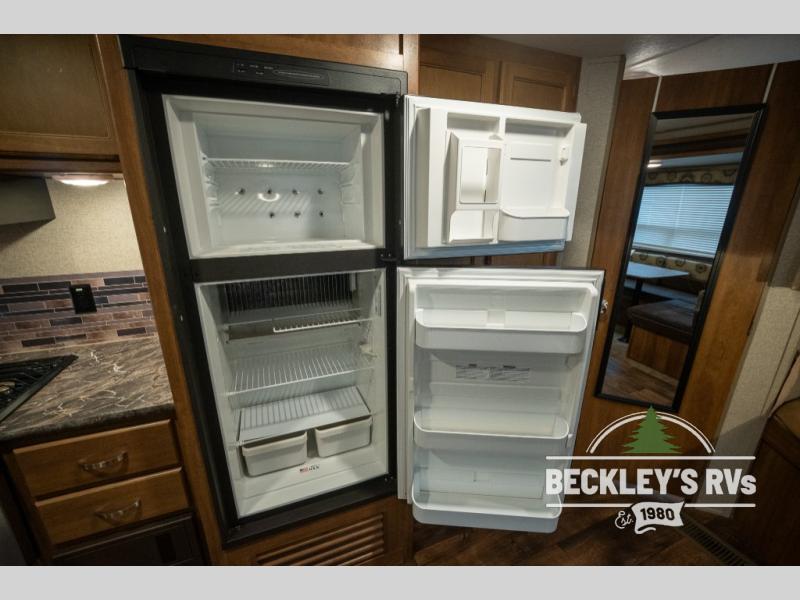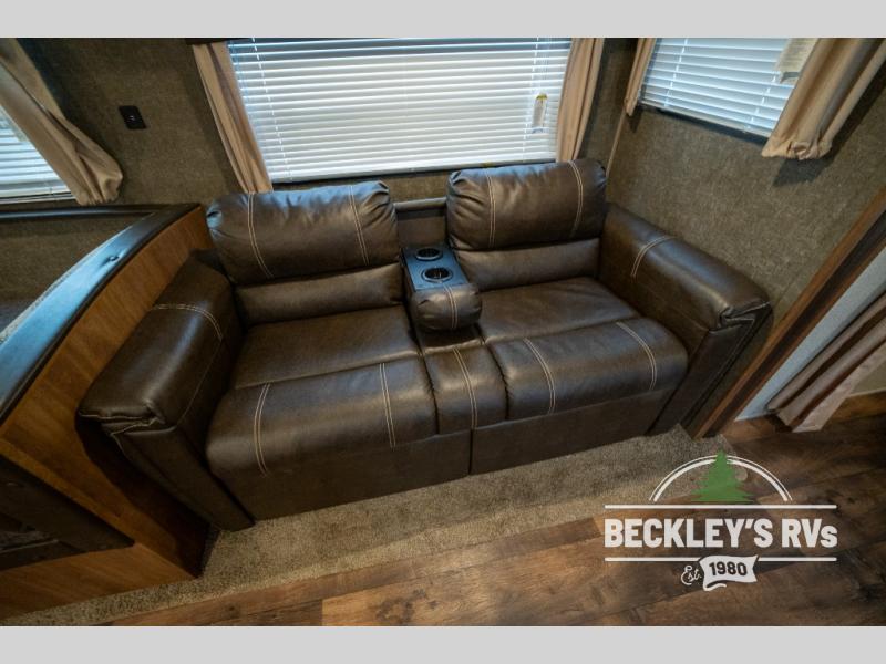 Step into the main entry and see just how spacious the combined kitchen and living area thanks to the slide out along the road side. Within the slide out you will find a jack knife sofa with an overhead cabinet, and a u-shaped dinette.