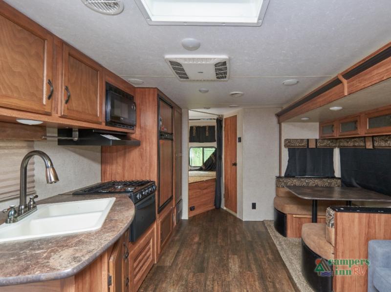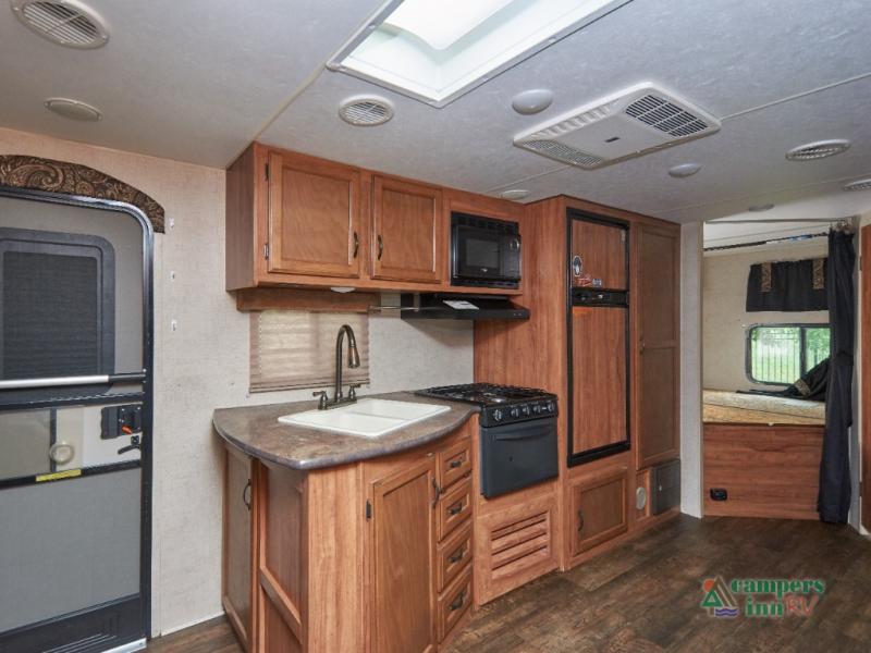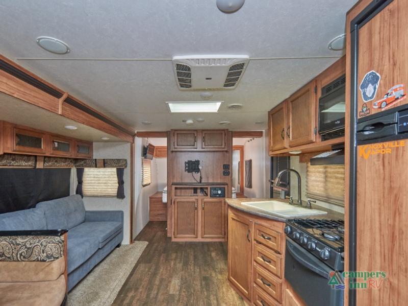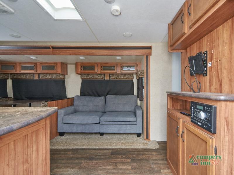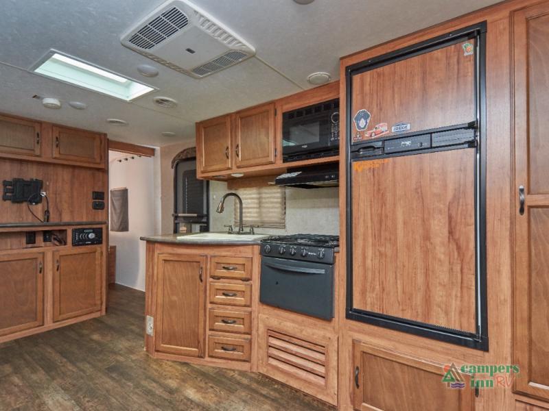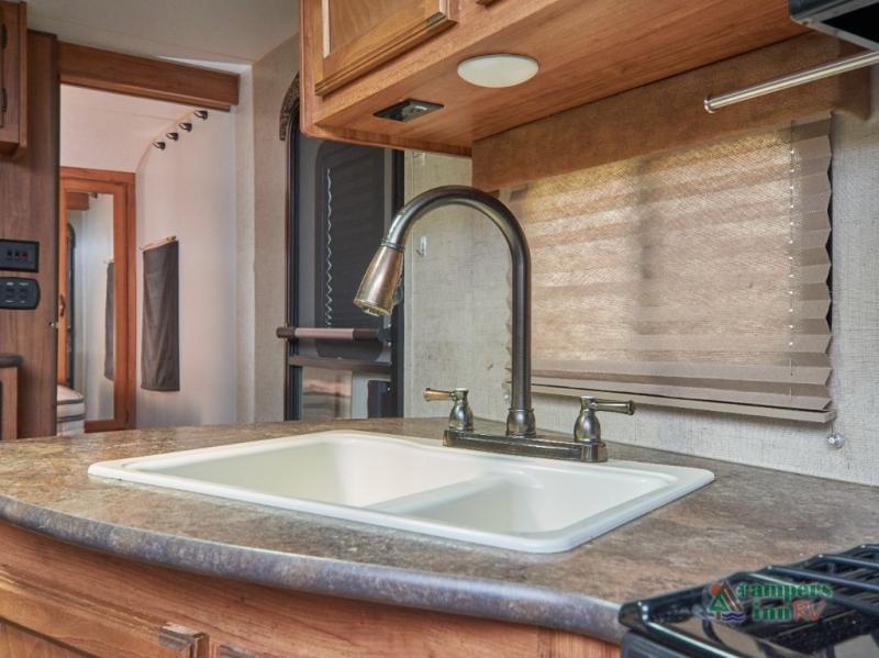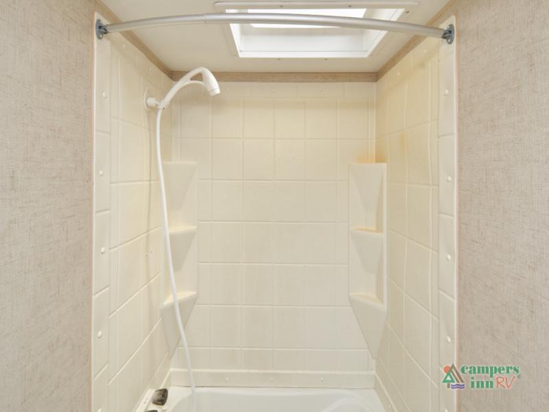Kitchen Features: The well-equipped kitchen includes an angled double sink, three-burner range, refrigerator, and pantry, giving you everything you need to prepare meals on the road.