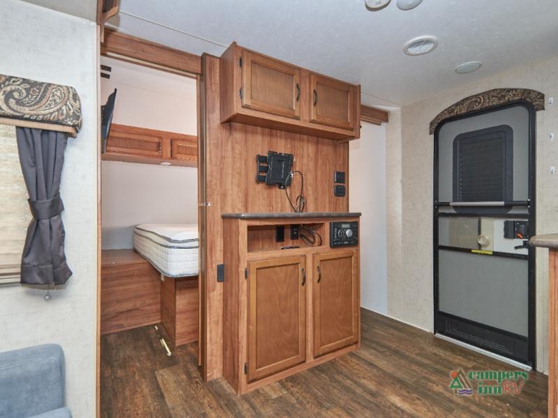 Interior Highlights: Step inside to find a cozy front bedroom featuring a queen bed and dual wardrobes, plus a convenient TV mount for evening entertainment. The central living area includes a slide-out with a sofa and booth dinette—perfect for relaxing or gathering around the entertainment center.
