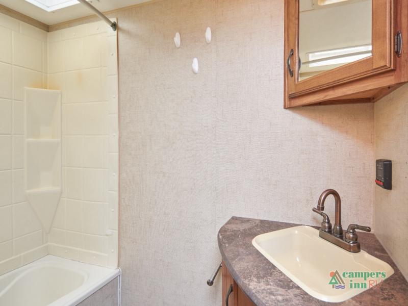Bathroom & Bunks: At the rear, you'll find a full bathroom with a tub, toilet, and sink. Adjacent to the bath is a set of double-size bunk beds—ideal for kids or guests.