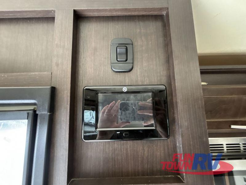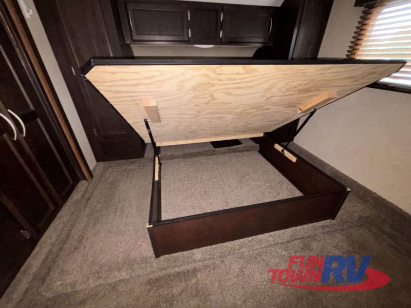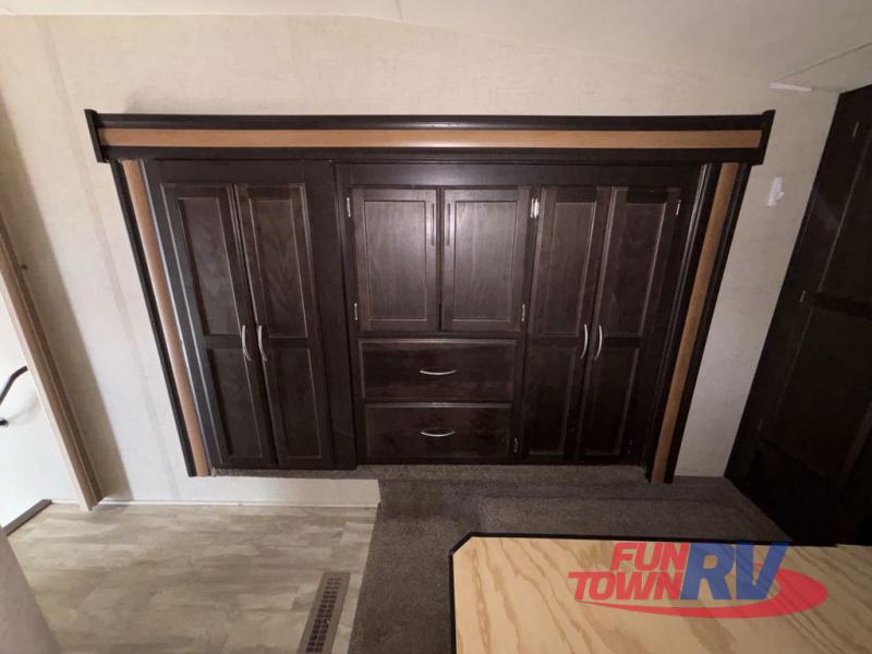 The front bedroom features a slide out with two closets and a dresser. Enjoy a good night's rest on the queen bed. Along either side of the bed there are closets, and an overhead cabinet will come in handy to store books or blankets. Across from the bed there is a TV mount.