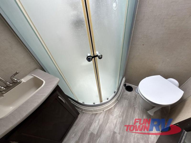 You will love the dual opposing slide outs in the kitchen/living area. When the slide outs are extended, it really helps to open up the floor space. To the right of the entry door you will find a slide with a sofa or choose an optional sleeper sofa. Adjacent to the slide out there is a coat closet and an entertainment center. Along the road side you will find a large u-dinette where you can enjoy your meals and at night convert this area into additional sleeping space.