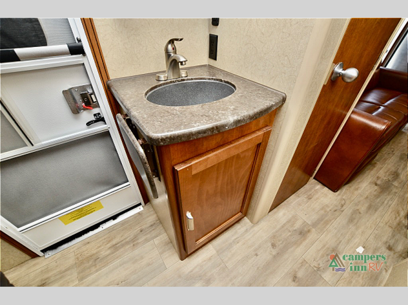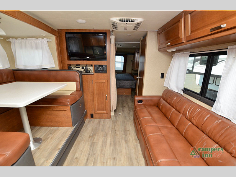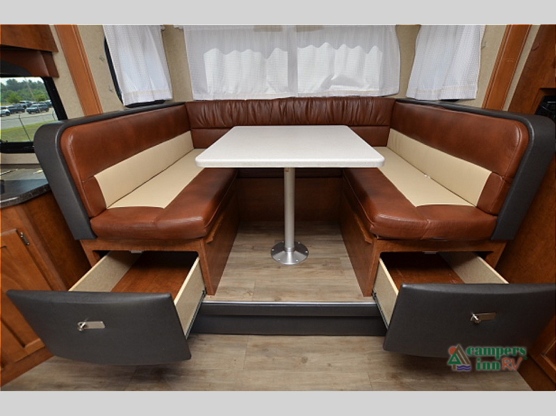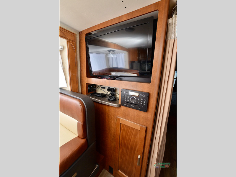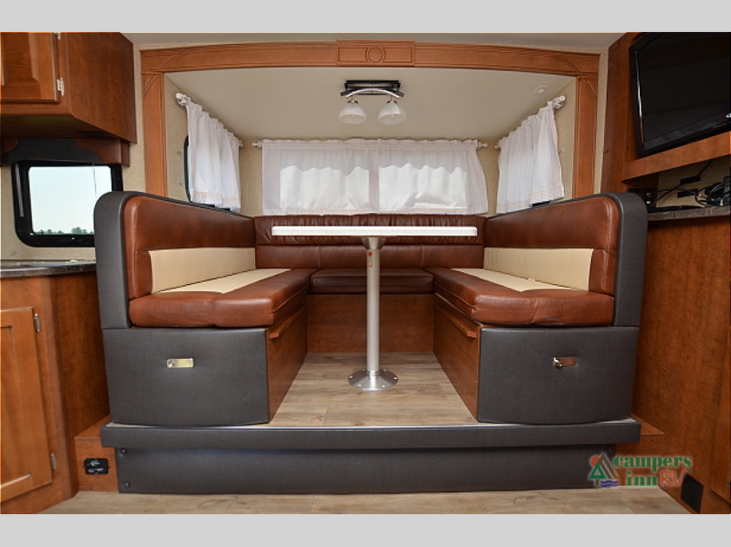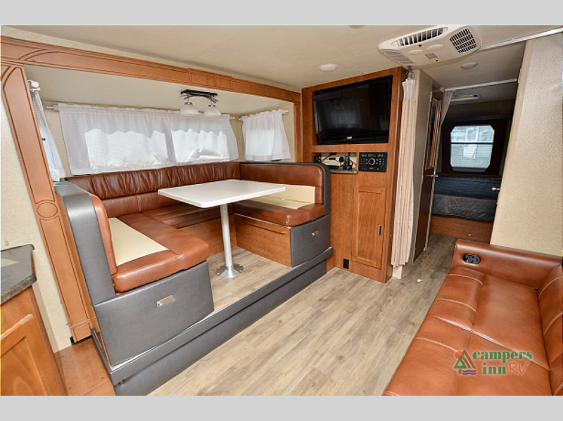The slide out u-shaped dinette and sofa bed are opposite one another and each sleep two individuals comfortably when folded down at night. The convenient entertainment center nearby can easily be viewed by any seating in the room.