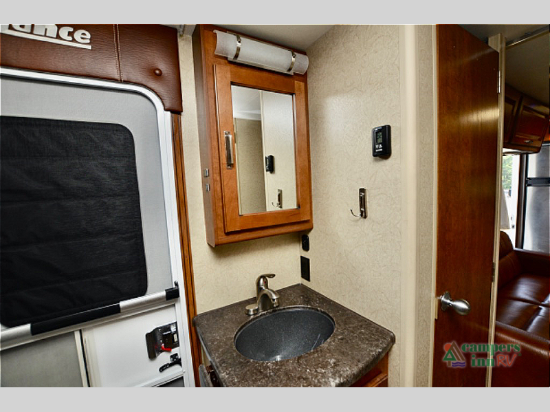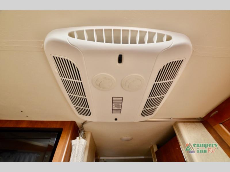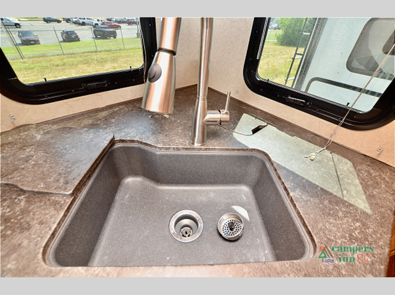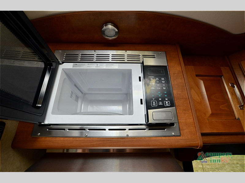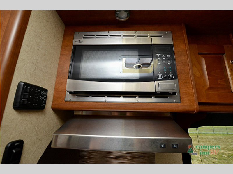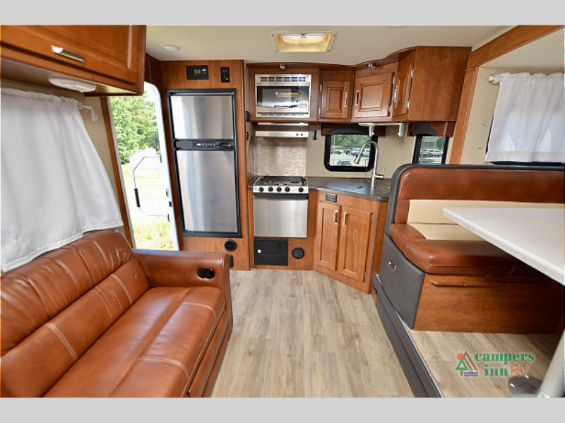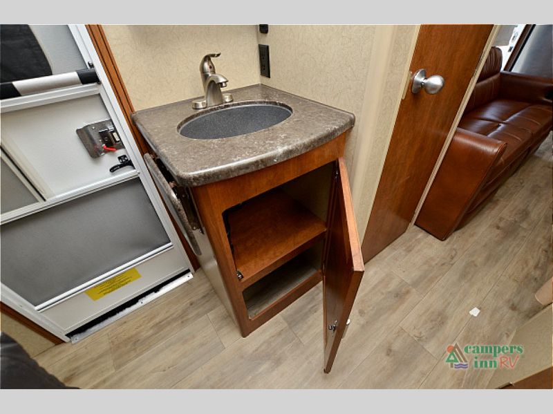 The slide out u-shaped dinette and sofa bed are opposite one another and each sleep two individuals comfortably when folded down at night. The convenient entertainment center nearby can easily be viewed by any seating in the room.