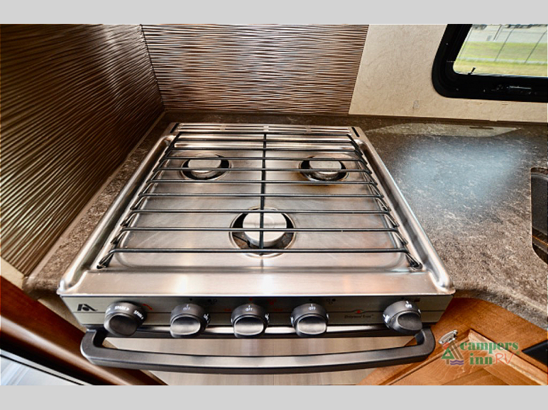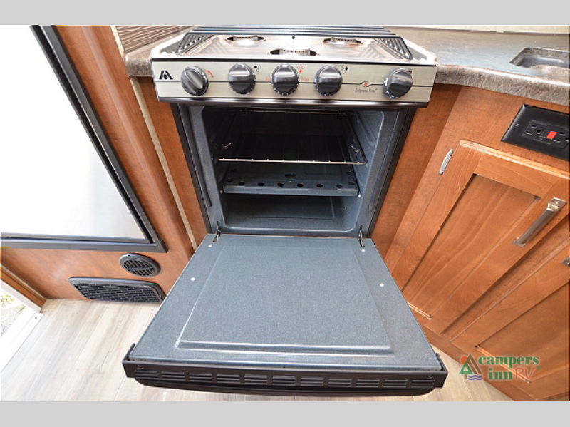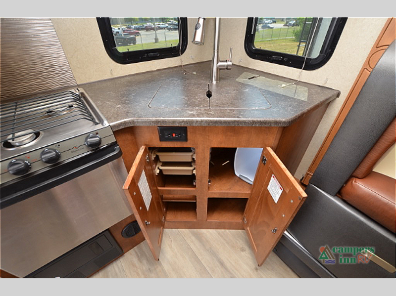 Enter the main door and find yourself in the galley kitchen area with a refrigerator, a three burner range, and a sink for easy cleanup. There are also overhead storage cabinets for dishes, canned and dry food items, and more.