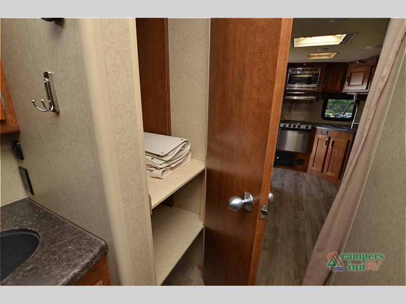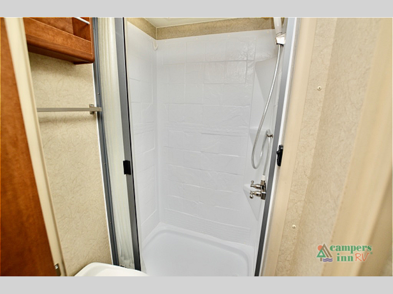 Moving toward the front of the unit you will notice a handy wardrobe on the right. On the left side you will find a private shower and toilet area with separate sink across the hall.