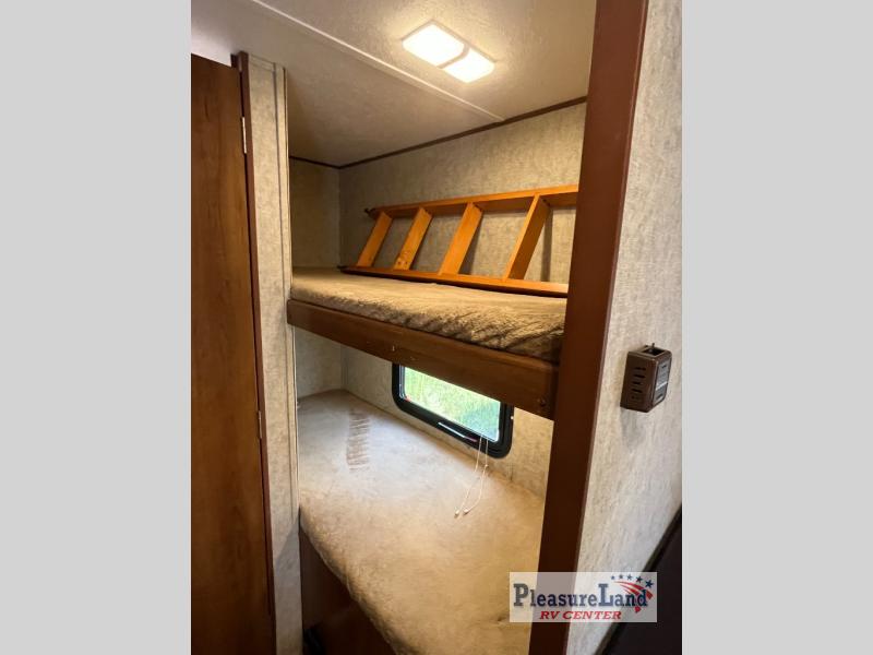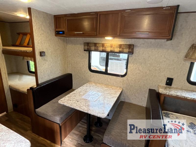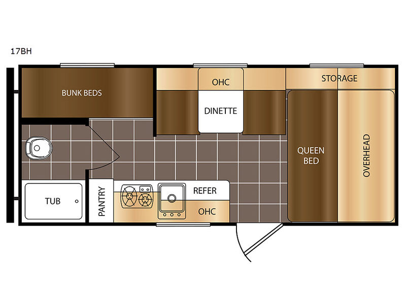 Upon entering the travel trailer, to the right there is a queen bed with an overhead cabinet. Next to the bed you will find a dinette and another overhead cabinet. Easily fix your meals in the kitchen area. Here you will find a refrigerator, sink, two burner range, and pantry.