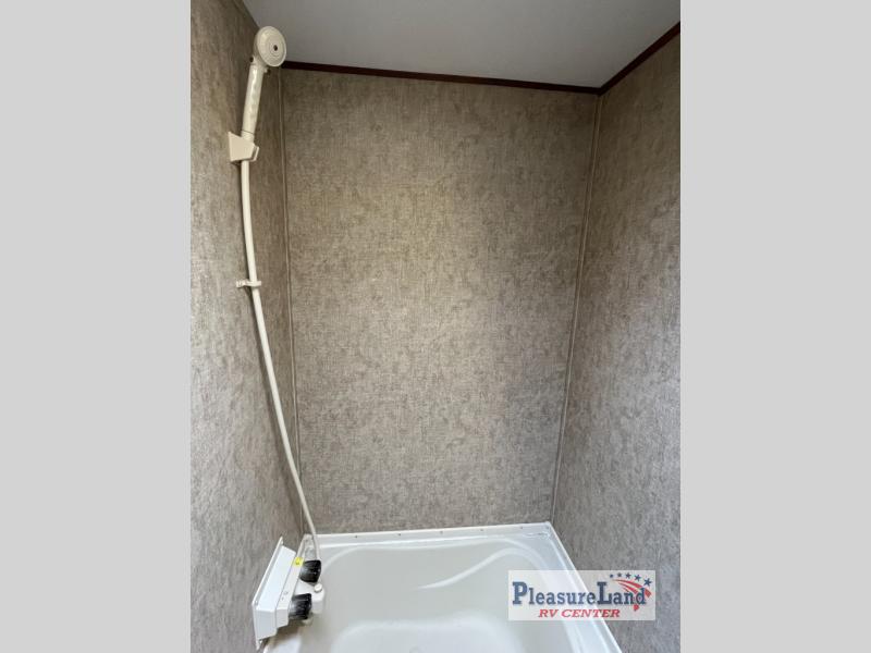 The bathroom is located in the left rear corner of the trailer. Here you will find a toilet and a tub.
