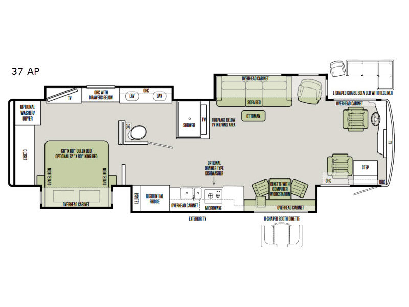 There are many options that you can add to make this 37 AP model perfect for you. You can add a u-shaped dinette, a drawer type dishwasher, L-shaped chaise sofa bed with recliner. You can also replace the queen bed with a king if you like a bit more room at night, and more!