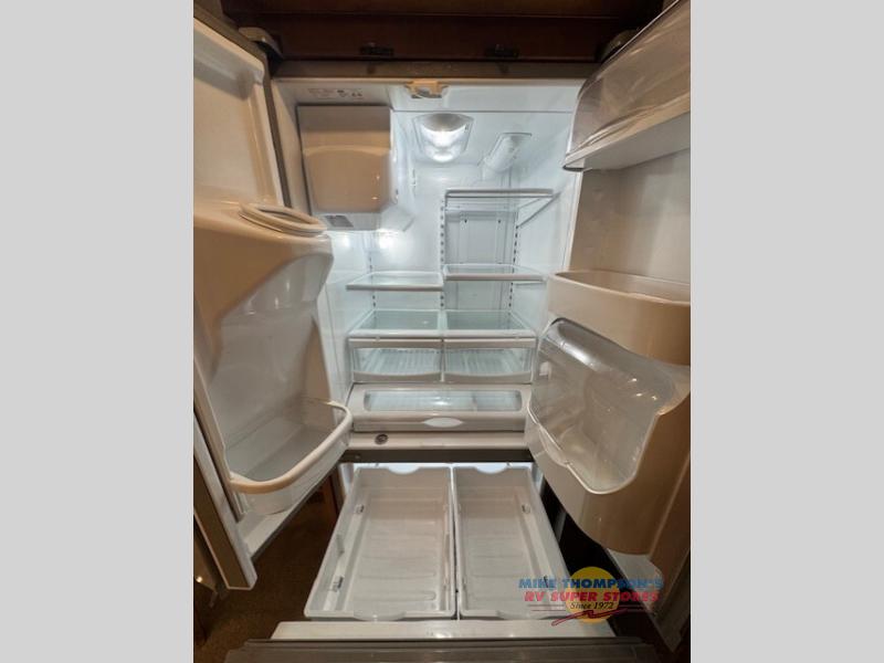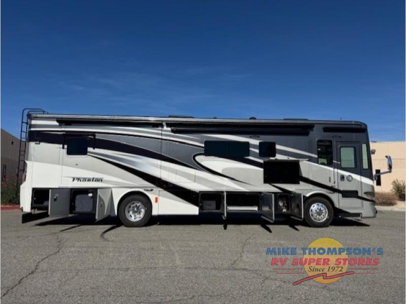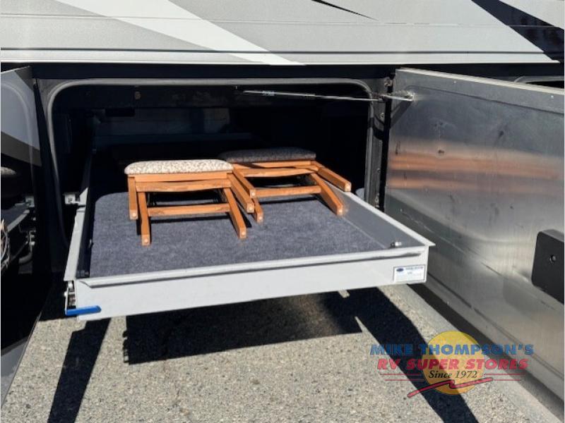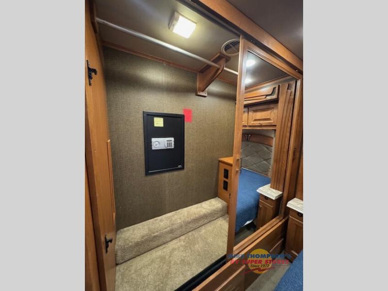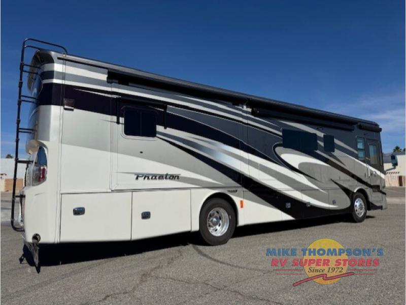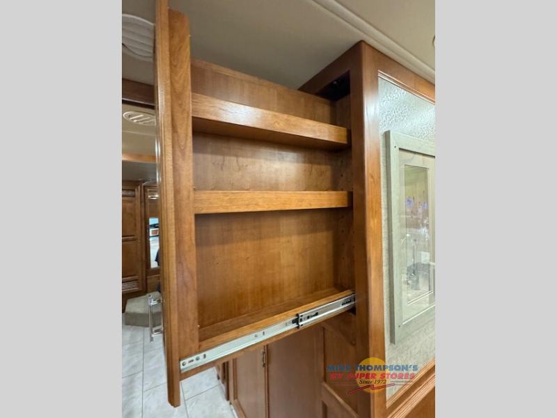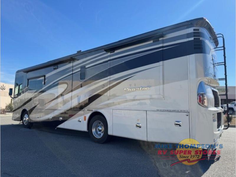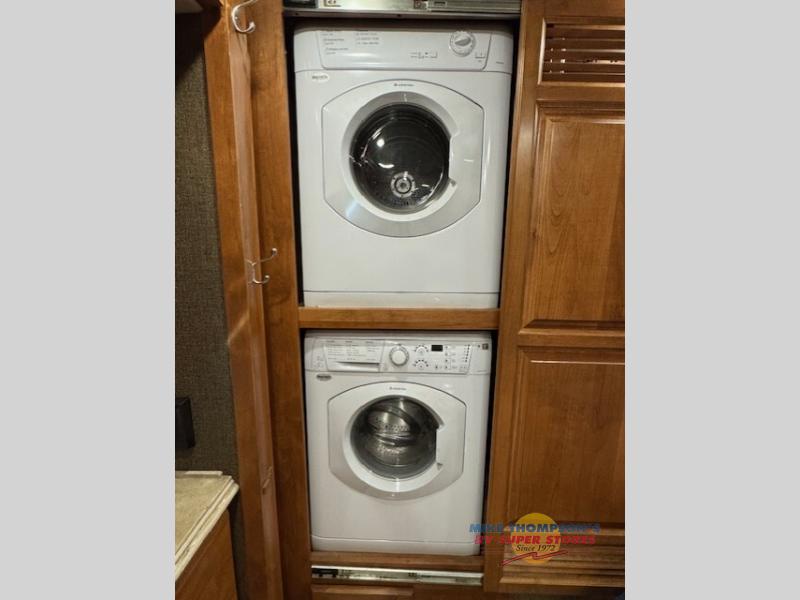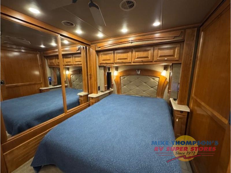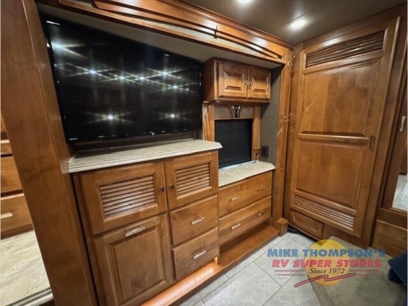 This Tiffin Phaeton 36 GH class A diesel motorhome offers a rear bedroom. The bed is within a slide out, and there is a nightstand on each side and overhead cabinets above the head of the bed. The rear wall of the coach has a large closet as well as a corner closet where you can add an optional washer/dryer. The wall opposite the bed includes another slide out with an overhead cabinet, a TV, a hamper, and drawers below.