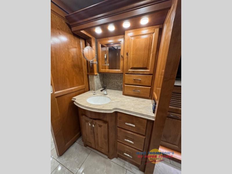 Just outside the bedroom, this slide continues with overhead cabinets and a large vanity with sink. A side aisle bathroom is across the hall and includes a corner shower, toilet, and corner vanity sink.