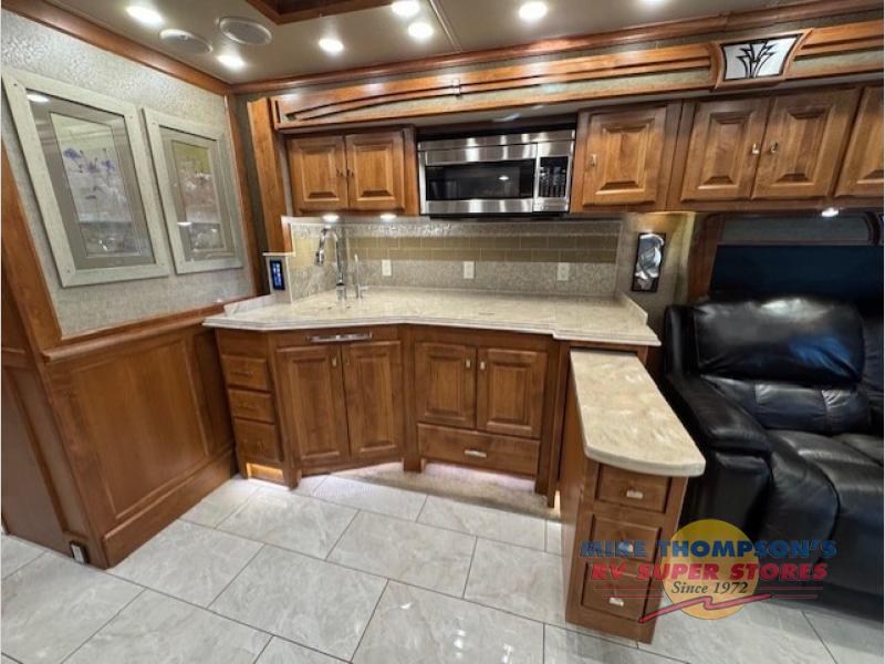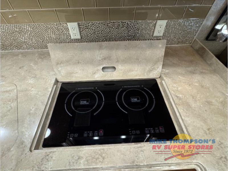 Along the road side a fourth slide out features a sofa bed, overhead cabinet, range, overhead microwave, and angled double kitchen sink. You may choose an optional L-shaped chaise sofa bed.