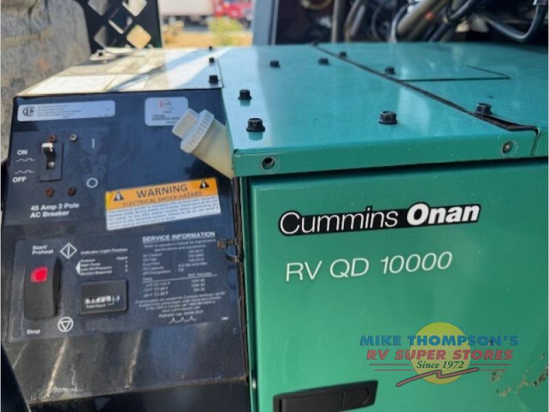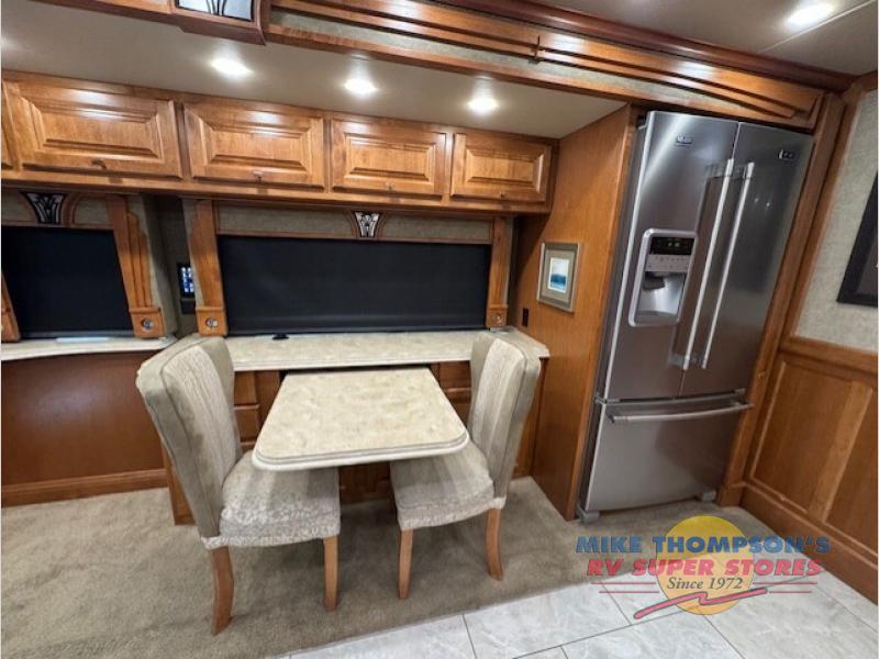 Moving into the living/dining area, the curb side has a slide out with a residential refrigerator, booth dinette, chair, overhead cabinet, and a TV in the corner with an optional fireplace. In place of the booth dinette you may choose a dinette with computer workstation, a U-shaped booth dinette, or sofa bed.