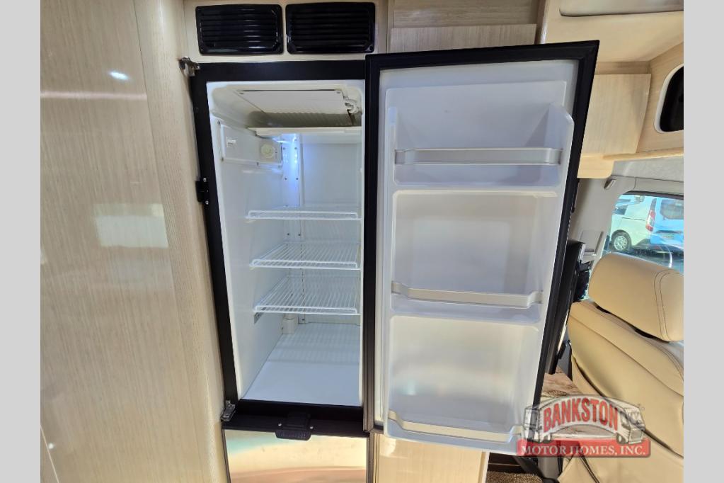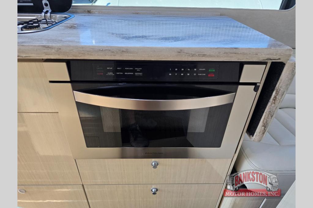 Step inside and find a convenient conversation area with the driver and passenger seats swiveled around. There is a removable table between the driver and passenger seat which allows for ease while eating or easy ability to play a game. Behind the driver's seat there is a work station and an LED TV.