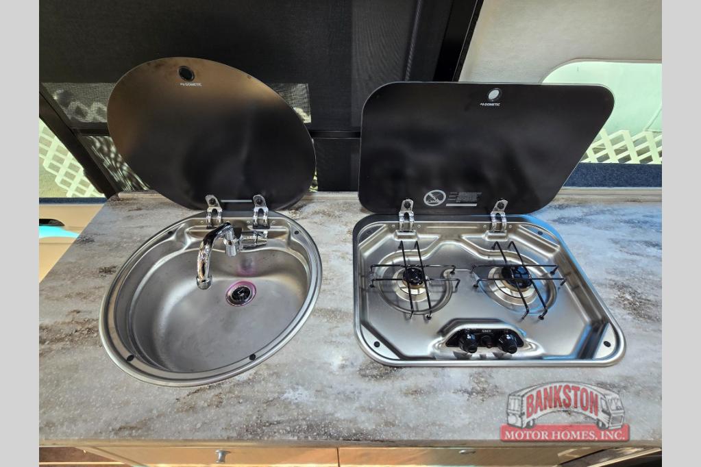 The galley has a sink, two burner range, and flip-up shelf along one side. The opposite side offers a large pantry/wardrobe and a refrigerator with freezer.