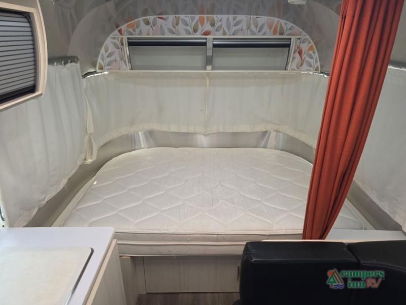 In the front, you will find a bed, nightstand, and a curtain for privacy.