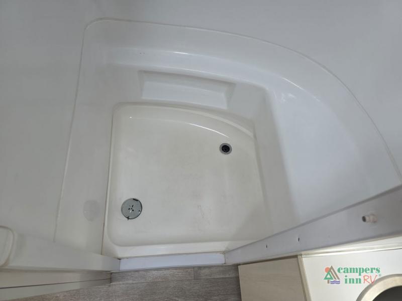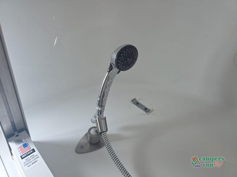 As you enter the travel trailer, to your left in the rear you will find a full bathroom with a shower, vanity with sink, and a toilet.