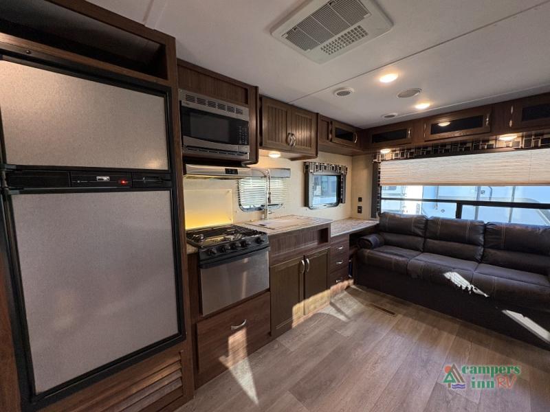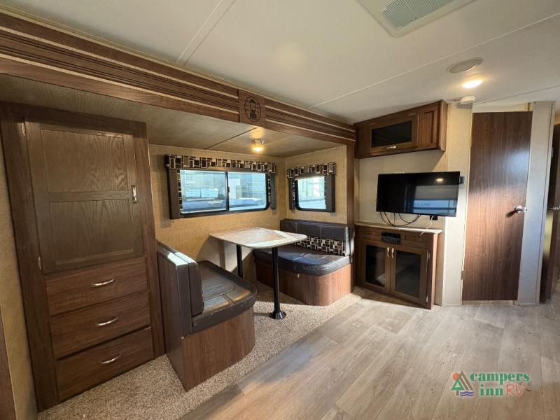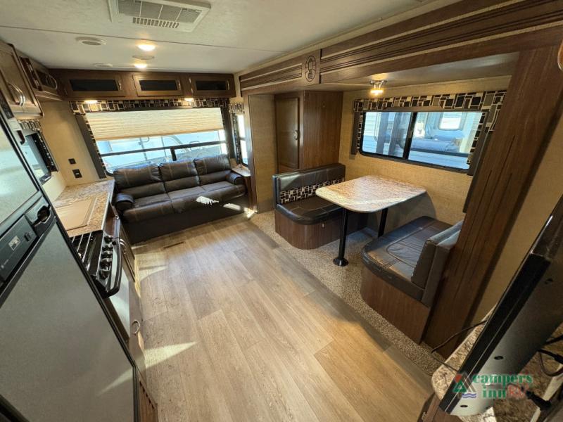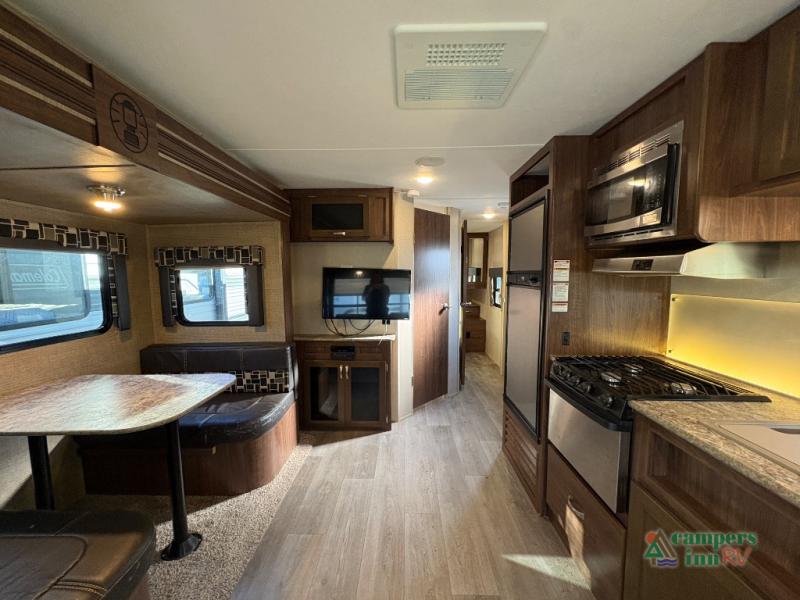 This Coleman Light 2515RL travel trailer provides sleeping space for five sleepy campers in the master bedroom and living area. If you are a single person, a couple, or a family, this model might just fit your active life style. You can make meals with the kitchen amenities while visiting with everyone then relax outside under the awning. If it's too cold to sit by the campfire, invite everyone inside to sit on the sofa or dinette. The kids might even sit on the floor. This model allows you quick access to the bathroom from the front bedroom and across from the exterior entry door. Come see what else makes this the perfect RV for you!