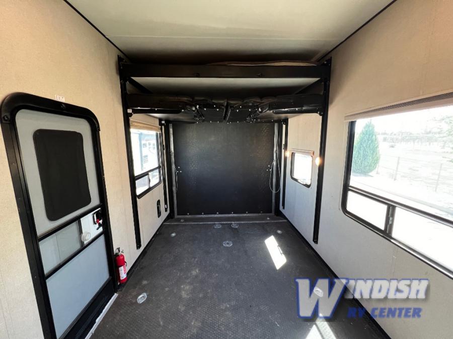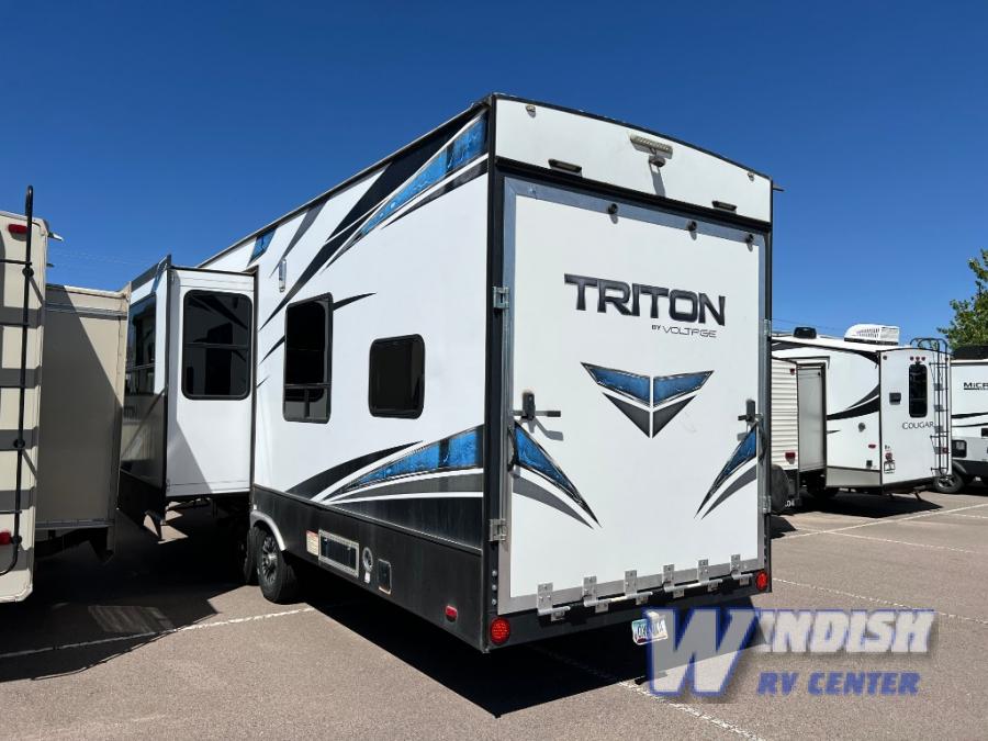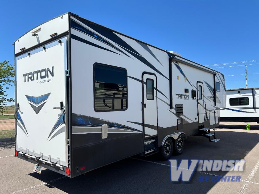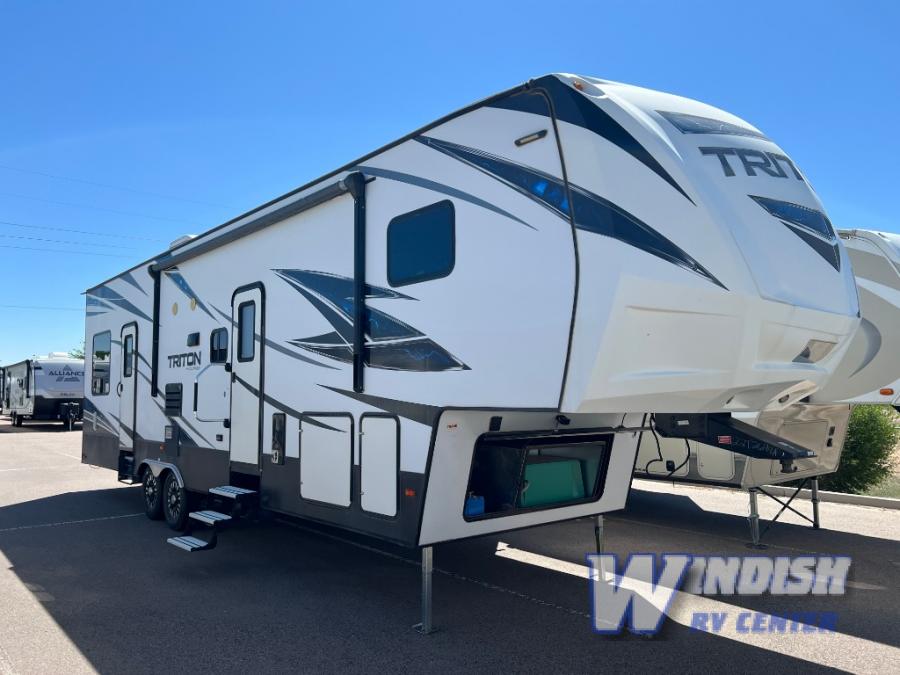 The fun has just begun when you decide to take this Triton fifth wheel toy hauler model 3451 with you. Your toys will have their very own separate area in the garage, you can relax in the living/kitchen combined room, and escape from it all in the master bedroom. Everyone will have a place to call their own when sleeping or hanging out. There is a rear Happi-Jack power bunk above two fold-up sofas with a table beneath, and a side man door in the garage. You will surely enjoy closing off this space with the glass patio doors between the garage and living area especially if the kids aren't ready for quiet time. With full kitchen and bath amenities you can cook, dine, and stay clean where ever you decide to play. You even have the option to choose a ramp door patio system, plus more!