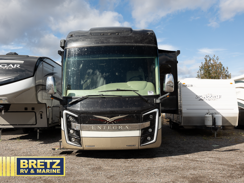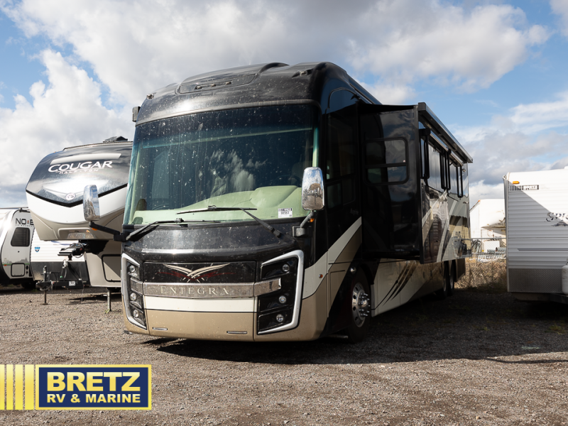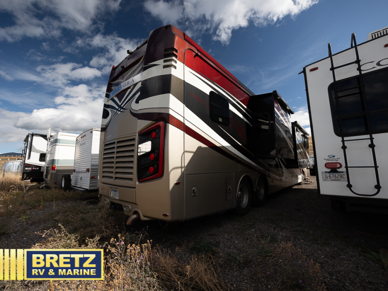 This Entegra Coach Aspire 44W class A diesel motor home features a king size bed for the owner, a rear full bath with a washer and dryer, a mid-cab half bathroom for everyone, and quad slides allowing plenty of space to entertain, plus more!