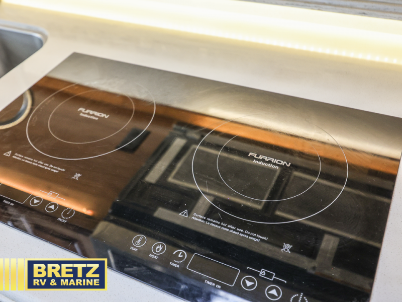 As you enter the passenger side of the motor coach to your left there is a slide out featuring a hide-a-bed sofa with a 50" TV with lift. The slide also includes a double kitchen sink, two burner range, microwave, shelf, and overhead cabinets for your dishes and things. On the opposite side you will see a sofa with two ottomans, a dinette with two chairs, refrigerator, and a pantry inside the second slide in this area. You can choose a booth dinette option and a theater seat option with two power recliners if you like. A 32" TV is in the front of the coach for additional inside enjoyment.