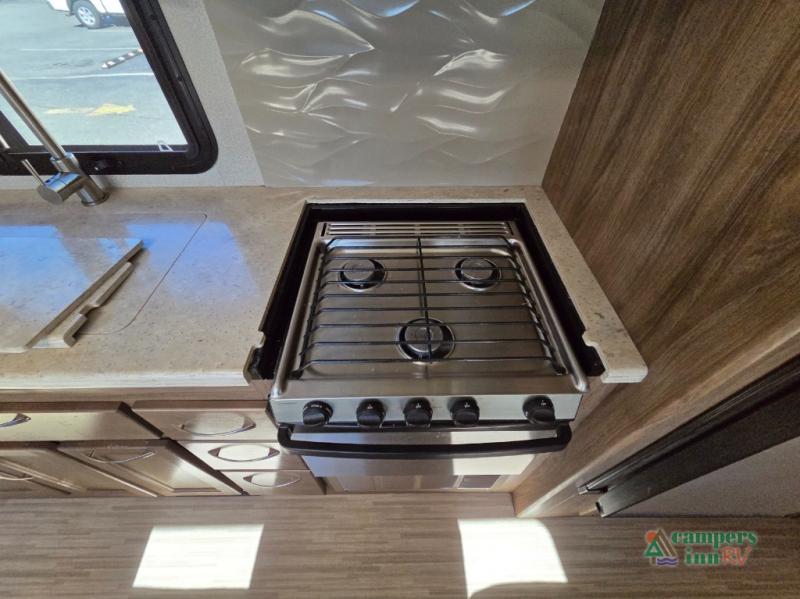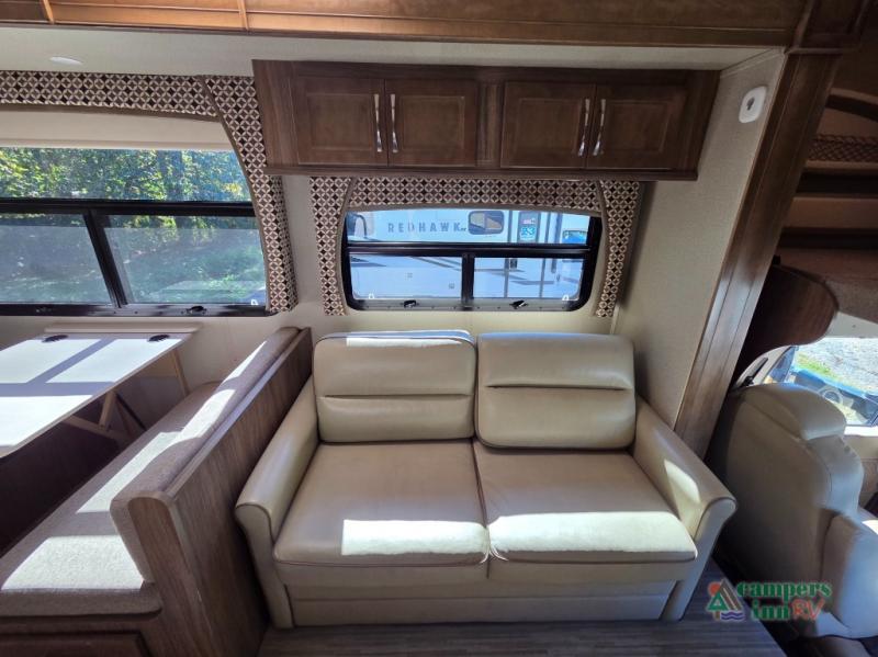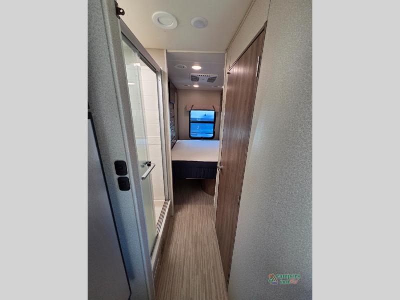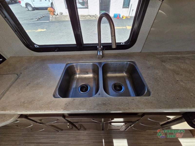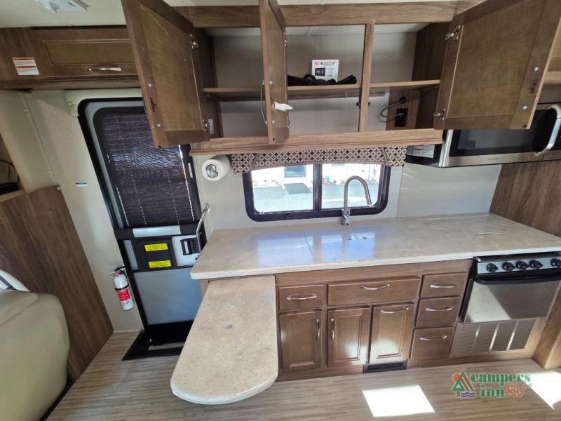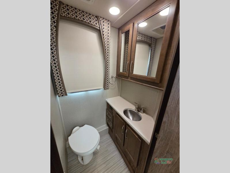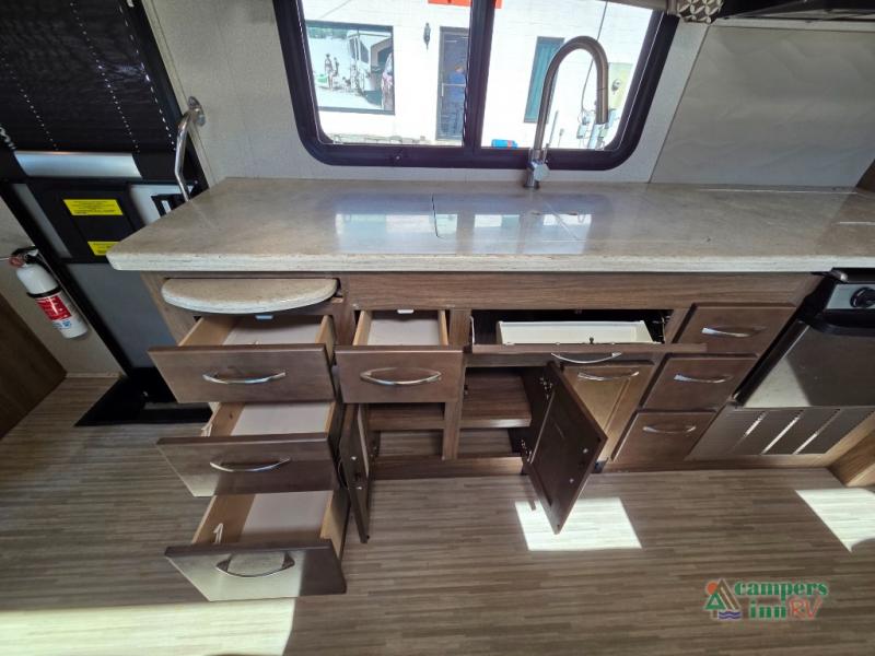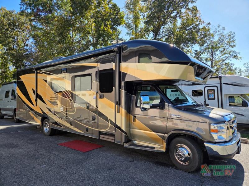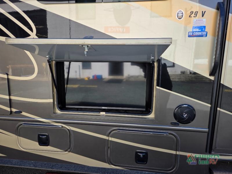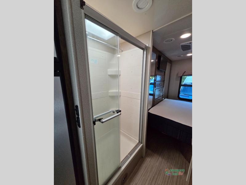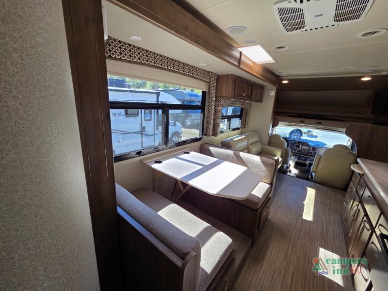 Enjoy the ride and the views as you travel to your next destination in this Entegra Coach Esteem class C motorhome! Model 29V offers a spacious layout with double slides for added roominess inside, plus a beautiful panoramic view out the front window. There is plenty of seating and sleeping space for seven anytime you travel, and you will enjoy complete kitchen and bath accommodations for meals and keeping clean and refreshed. There is even an outside shower, so when you come back from a day of hiking or sightseeing and you need to rinse off, you can do so before heading inside to relax. The outdoor entertainment space is also great for spending as much time outside as you like. A 16' electric awning with entertainment center including a 32" LED TV makes TV watching fun outside. And, with LED lighting included on the awning, you can easily do any task outdoors, even after dark!