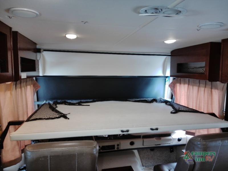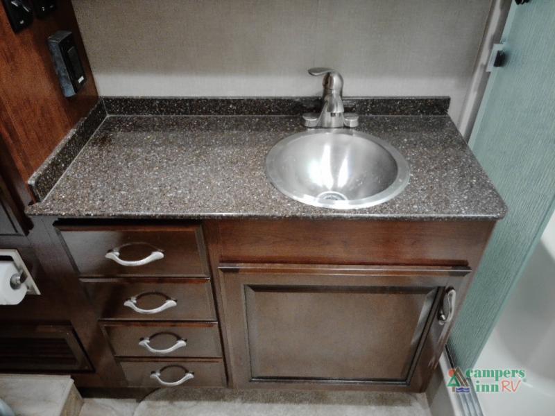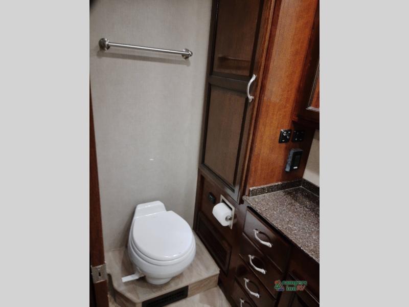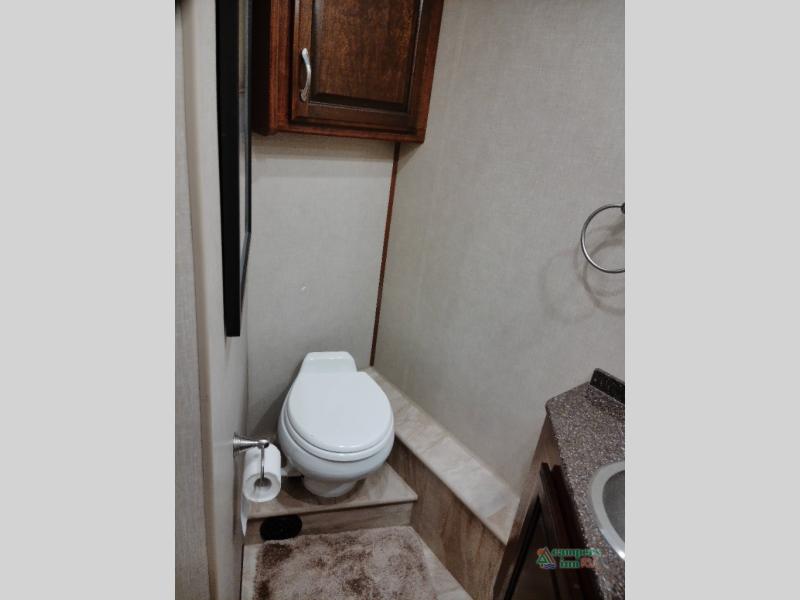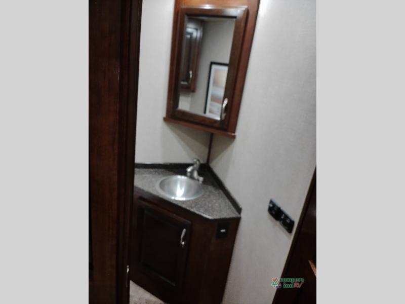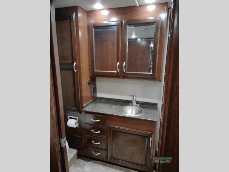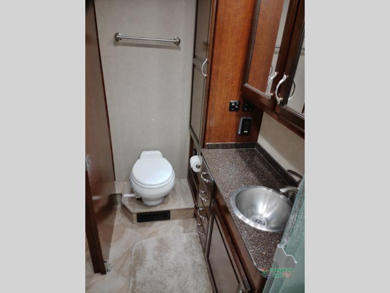 Mid-coach enjoy the convenience of a half bath including a toilet and corner vanity with sink. There is also overhead storage above both the sink and toilet for your bath products.