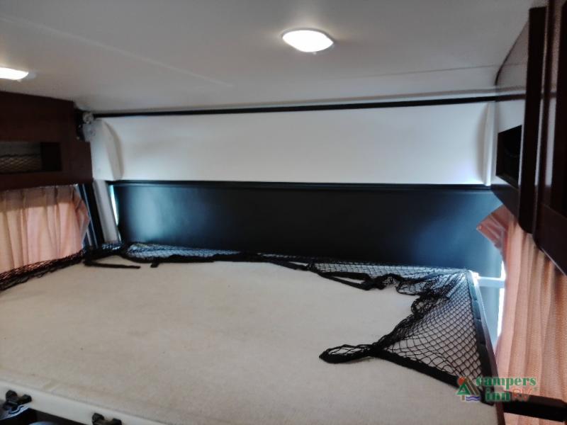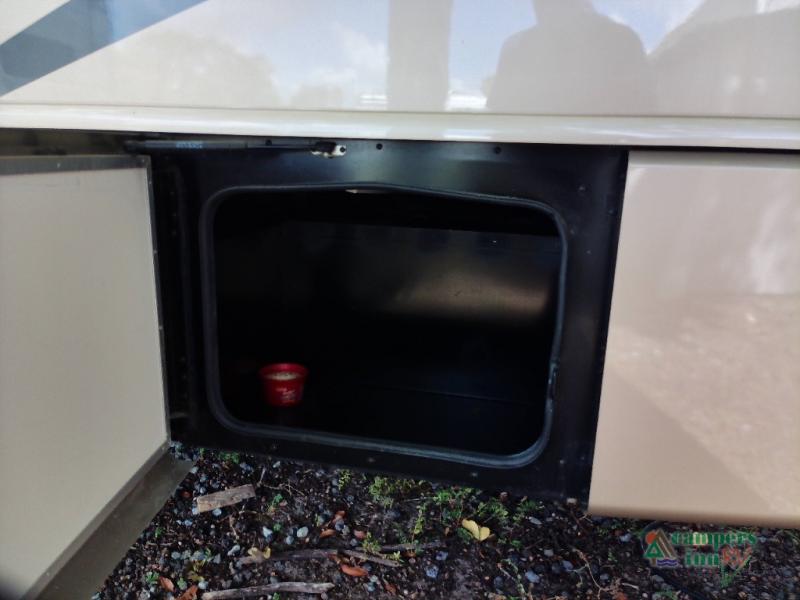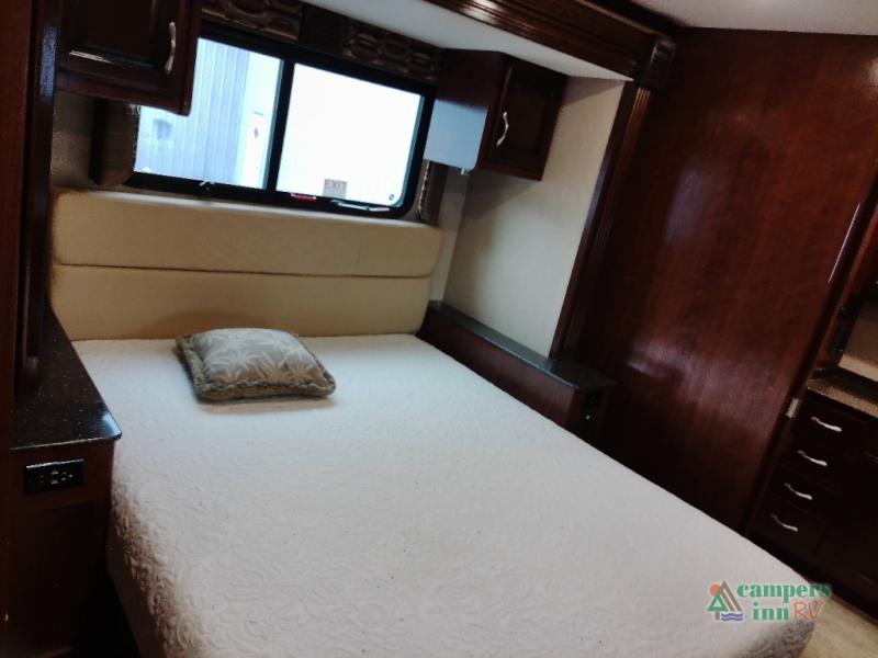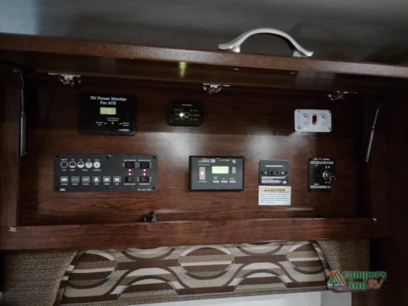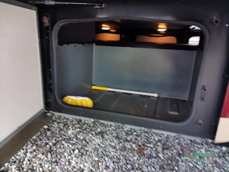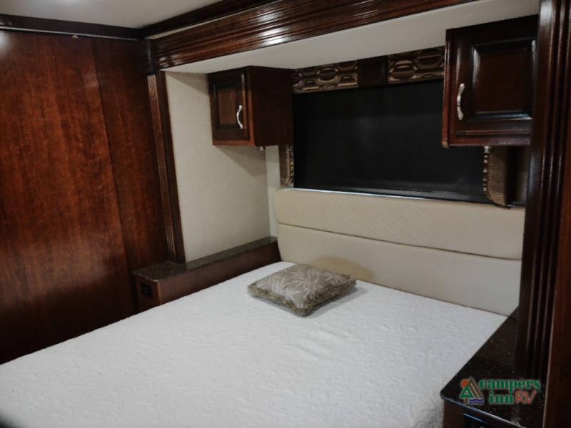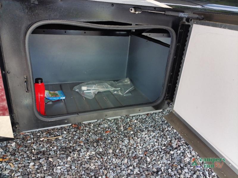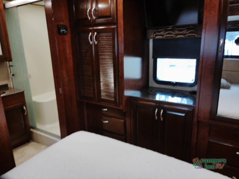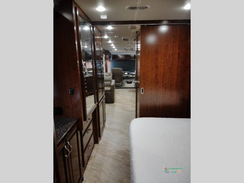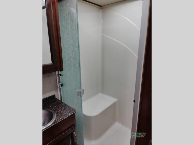 Next, a sliding pocket door leads you into the master bedroom and en suite bath. The bedroom features a slide out queen size bed with nightstands on both sides, plus overhead storage as well. Opposite the bed along the road side find a dresser with a 19" LED TV above, and dual wardrobes for clothing storage. Another sliding door leads into the rear master bath which includes a large shower, toilet, vanity with sink, plus storage, and so much more!