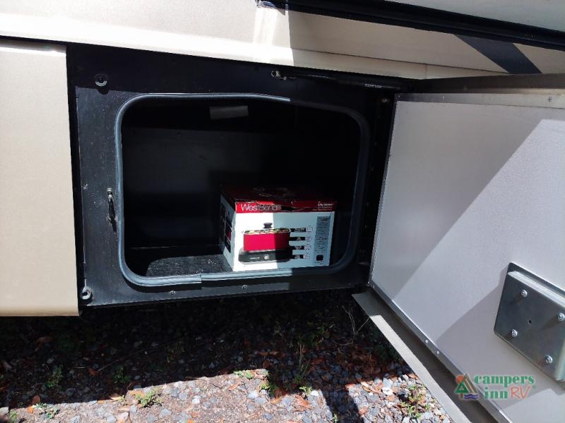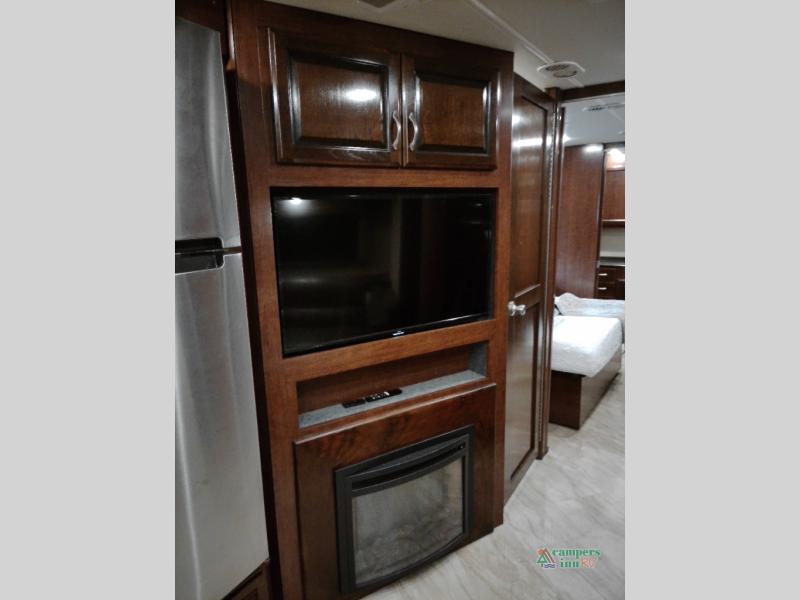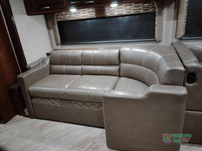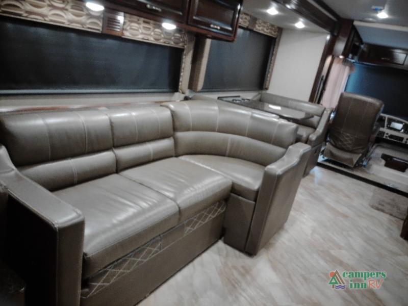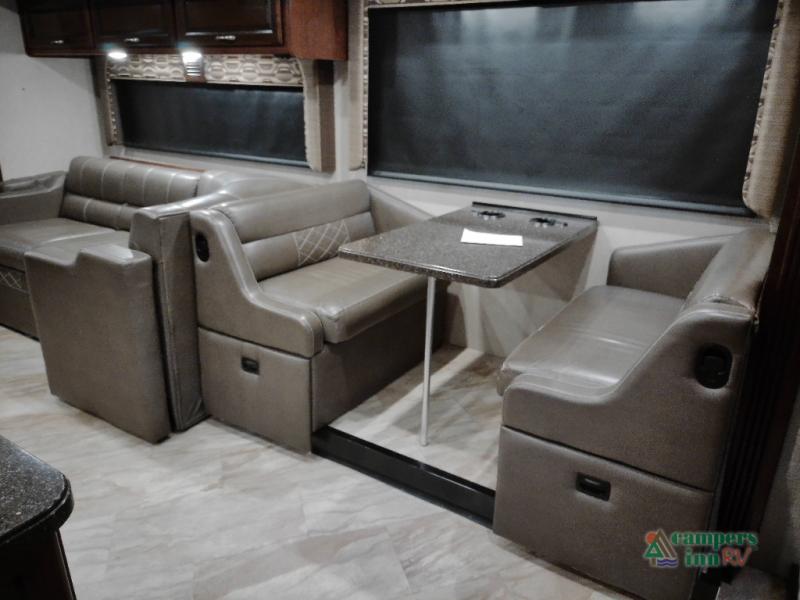 Enter and notice the large driver side slide out including a 42" x 76" booth dinette and 82" L-sofa with overhead storage. You can easily kick back and view the 39" LED TV and fireplace opposite along the angled half bath wall. If needed, both can be made into added sleeping space for overnight guests as well.