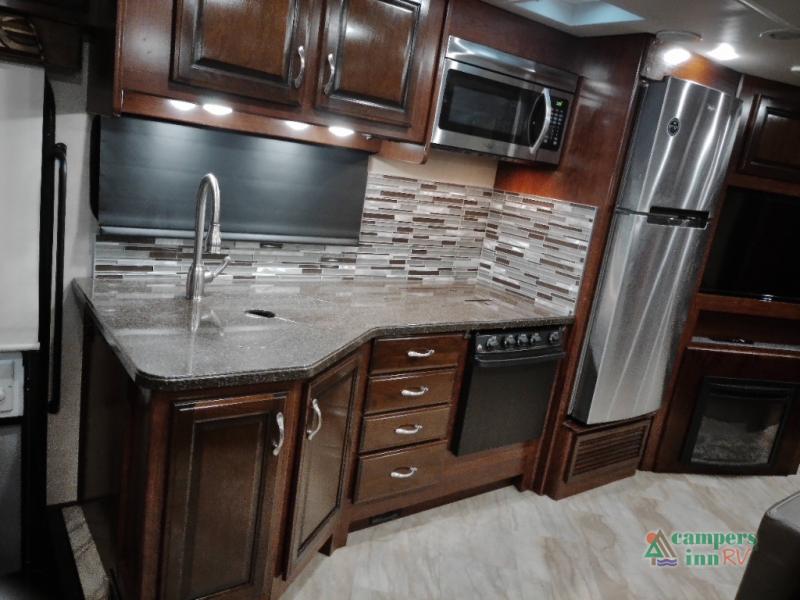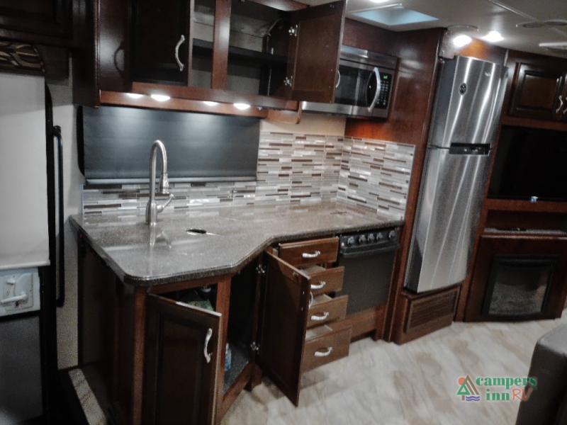 To the left of the entrance you will find the kitchen area. This space allows you to easily create meals and snacks while on the move. There is a residential size refrigerator, a three burner range with overhead microwave oven, and plenty of storage space for your dishes and pots and pans. You will also find a large double sink that makes cleaning up easy too. A nice size pantry is located off the L-sofa slide for all of your dry food, canned goods, and paper products, plus more.