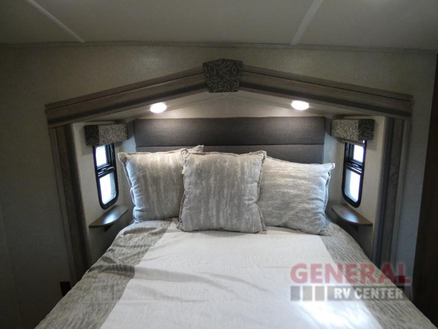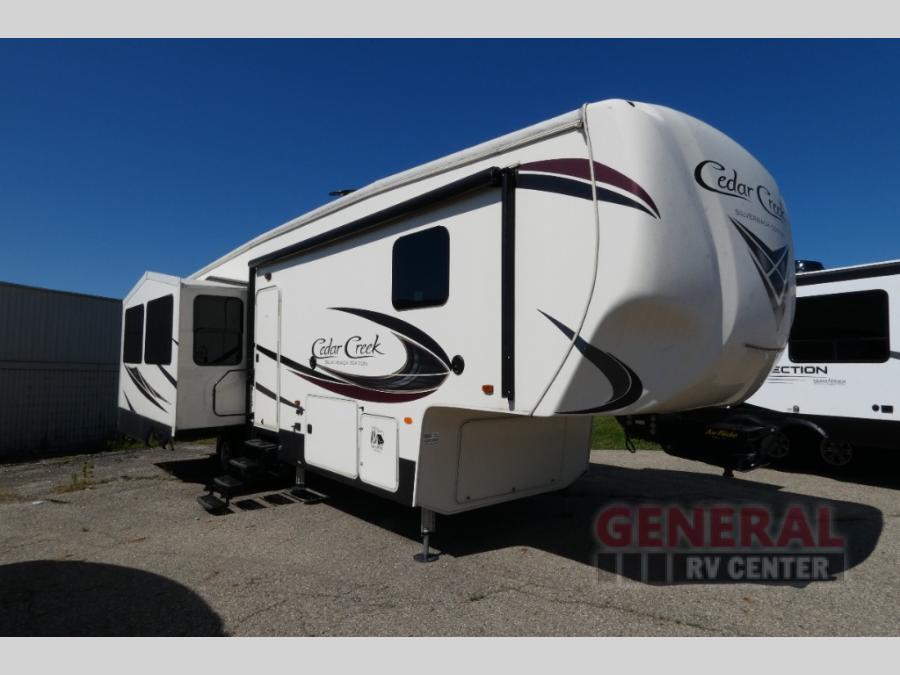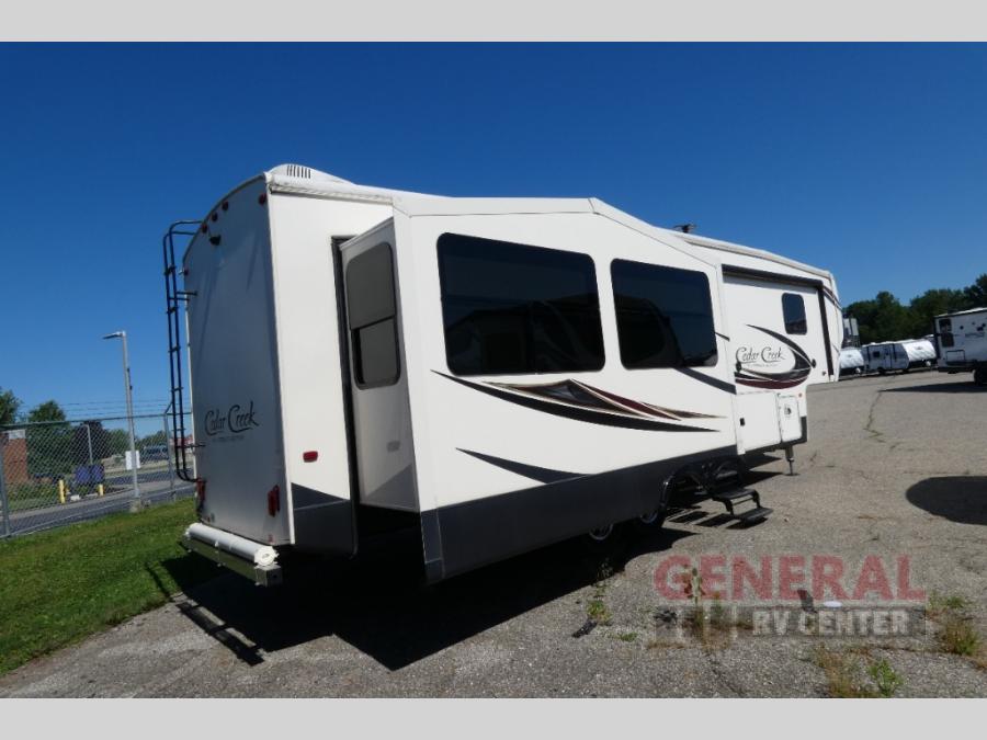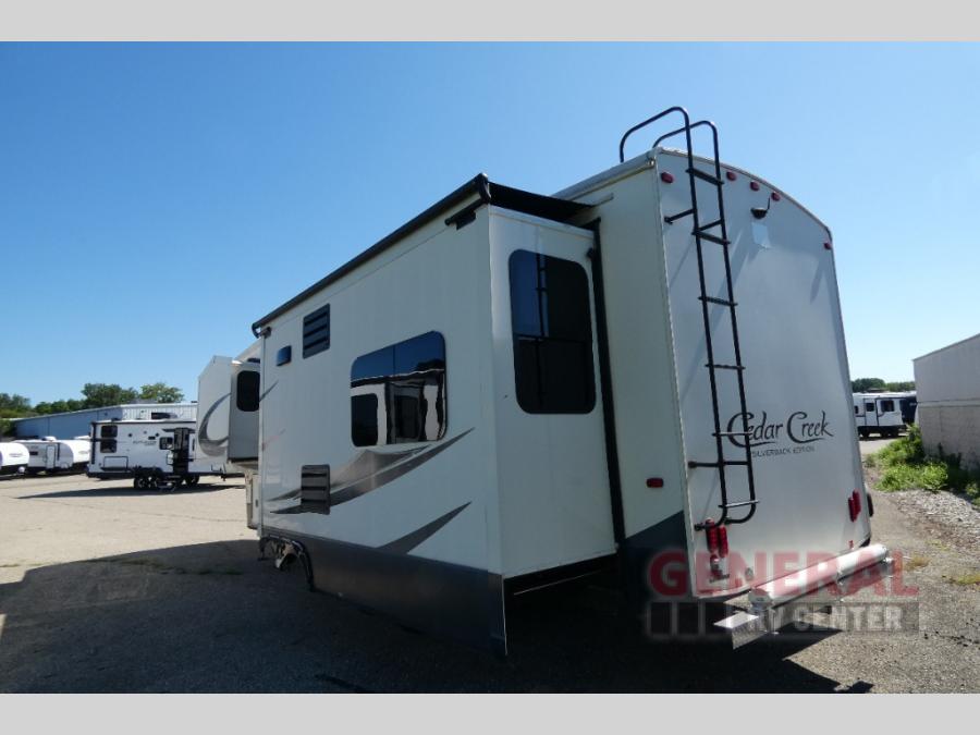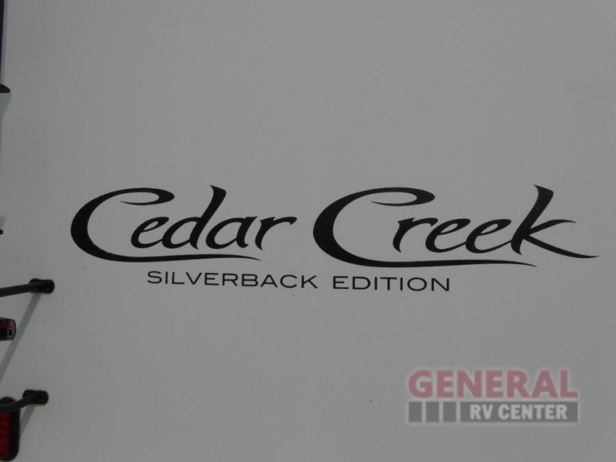 Start your next camping trip with this Cedar Creek Silverback fifth wheel 29RE by Forest River. This model features triple slide outs and two of the slide outs are in the rear of this model which helps to maximize the floor space. Enjoy watching your favorite shows or a movie or two at the rear entertainment center and for those chilly evenings you can enjoy the electric fireplace. The kitchen area features a free-standing table with seating for four plus along the interior wall there is extra counter space and a double sink. When you are ready to call it a day, then head up the stairs to the front bedroom.