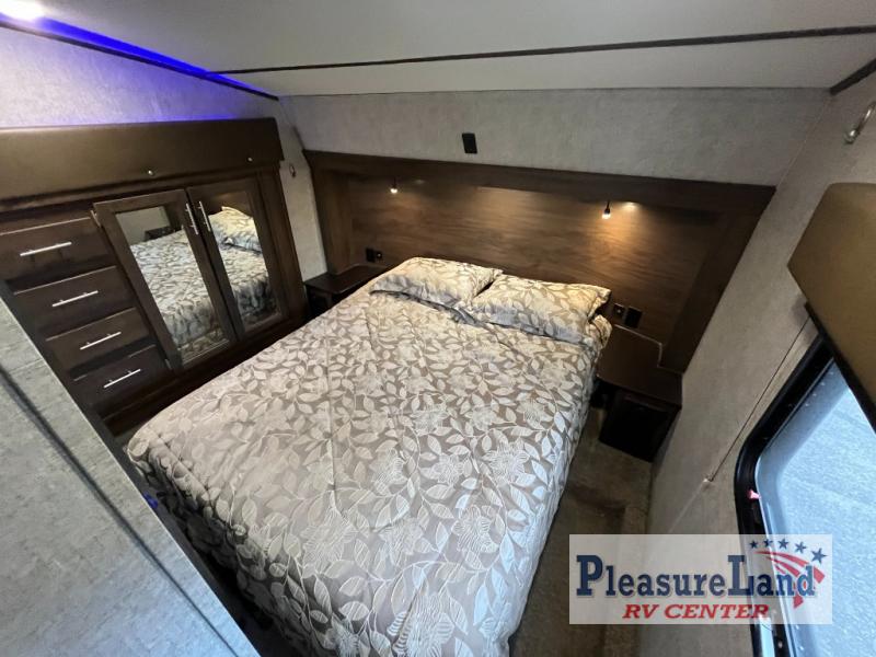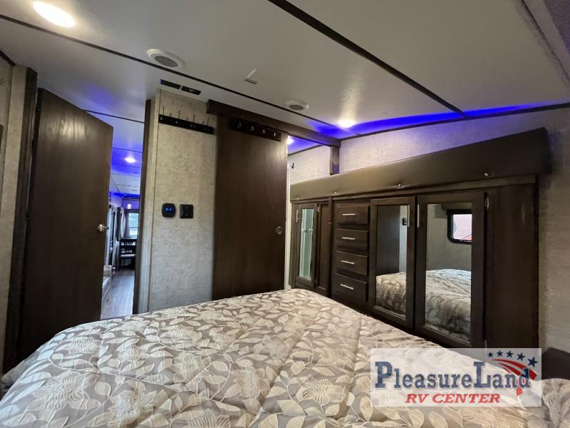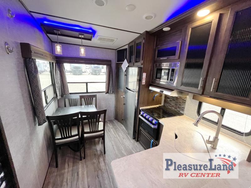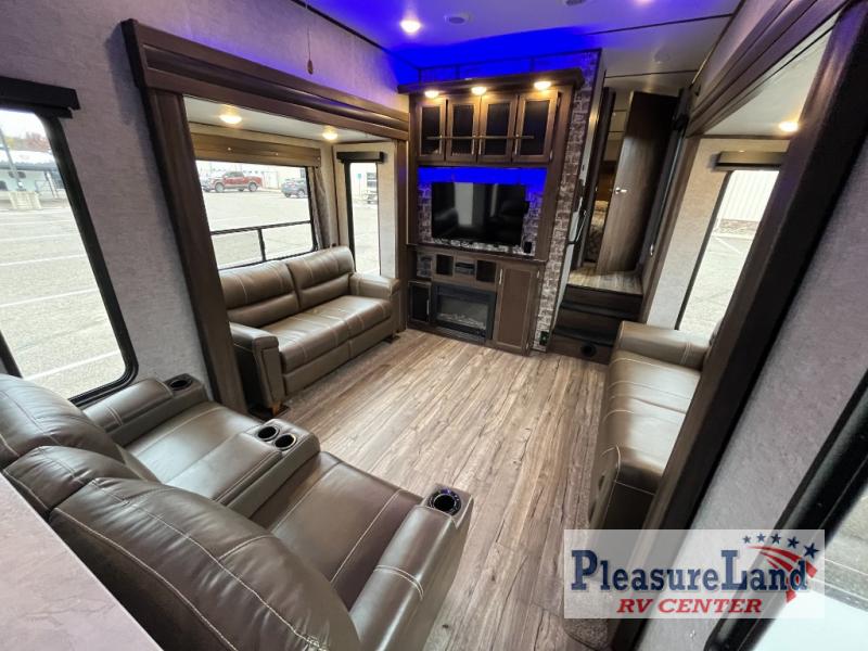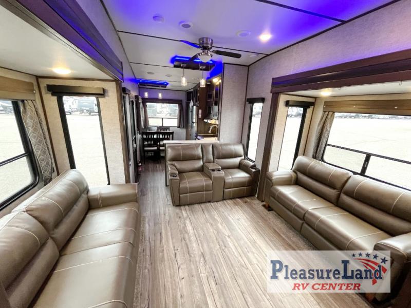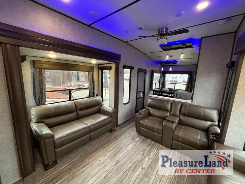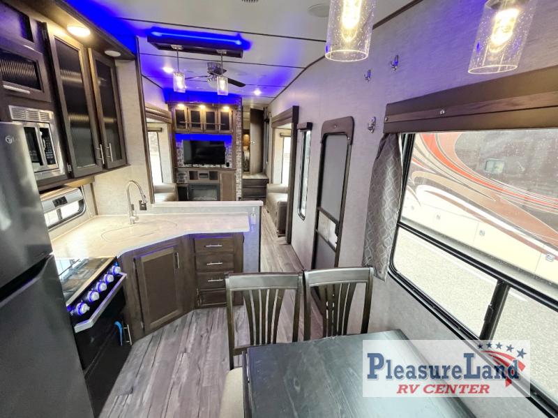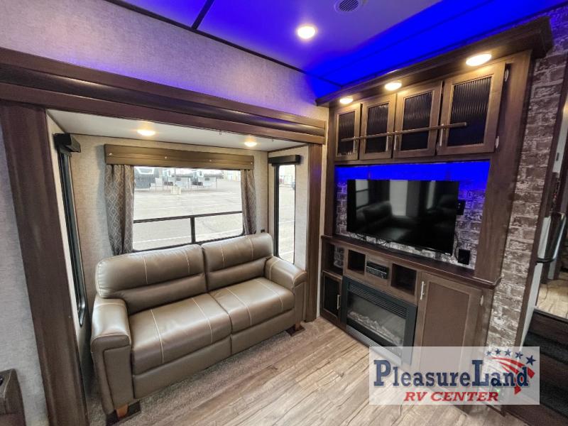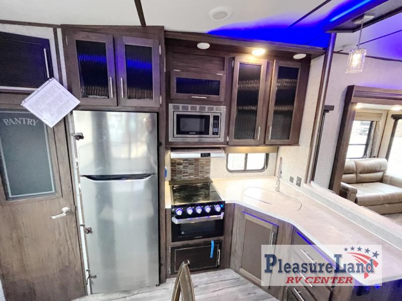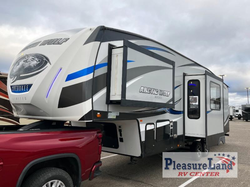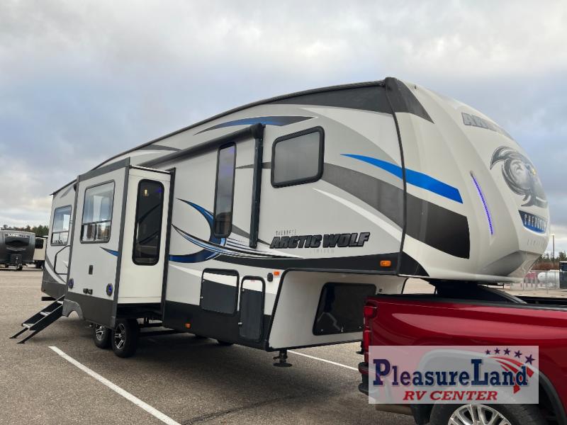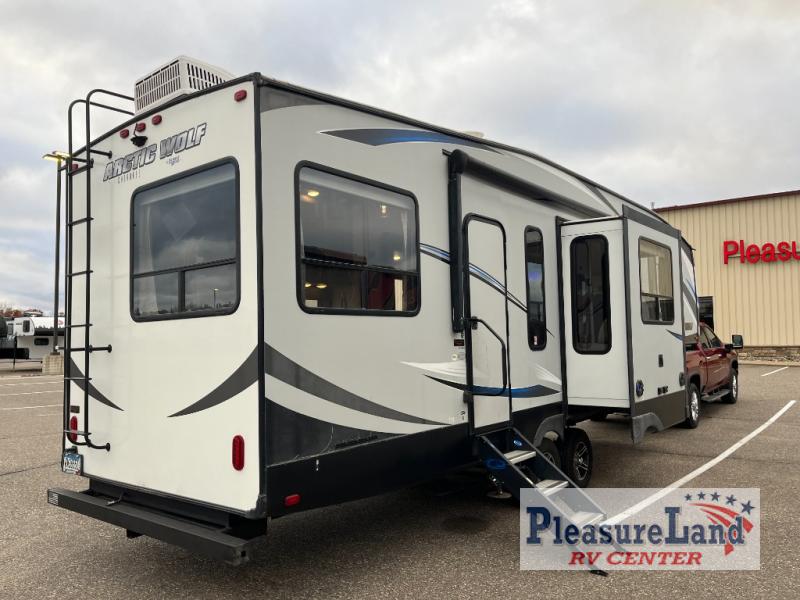 The home-like atmosphere of this Arctic Wolf fifth wheel will have you wanting to stay on vacation even longer. You will love the separation of living space from the kitchen and dining area in this unique rear kitchen unit that features a large pantry which can easily store all of the ingredients you need for s'mores and all of your other favorite snacks. The center living space offers dual opposing slides with a tri-fold sofa sleeper in each which is great for overnight guests, and the power theatre seating that has been included in this living space comes with massage and heat light capabilities that will melt away all tension as you relax for the evening. And when it's time to get some sleep, the private master suite will make it easy and comfortable to rest for tomorrow's new adventures.