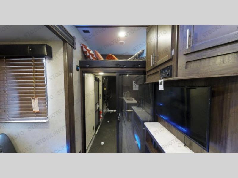 Come see just how fun and easy any camping trip can be with this double slide out Cherokee Wolf Pack 325PACK13 toy hauler fifth wheel. With the 13' of cargo space you can bring along a few dirt bikes, an ATV, or a four wheeler. After your gear is unloaded then set up the sofas. Above the sofas there is a Happijac power bed which offers sleeping space for two. Off of the cargo area there is a convenient half bathroom where you can clean up before coming into the main living area. Overlooking the kitchen and living area is the loft with a queen bed. At night you can retreat to the private front bedroom which features a queen bed with storage below and more!
