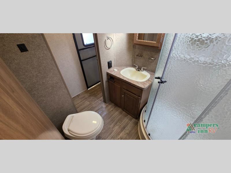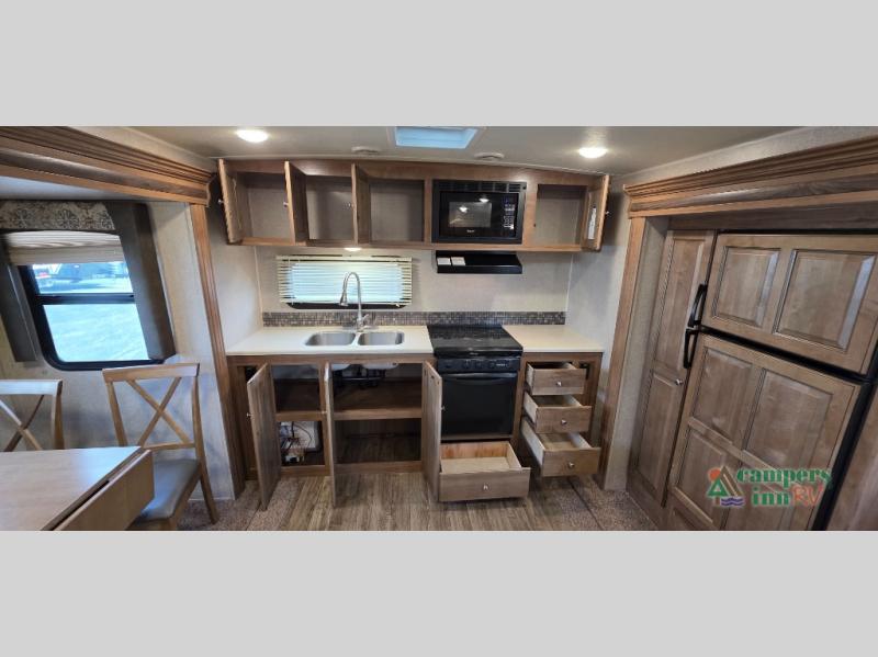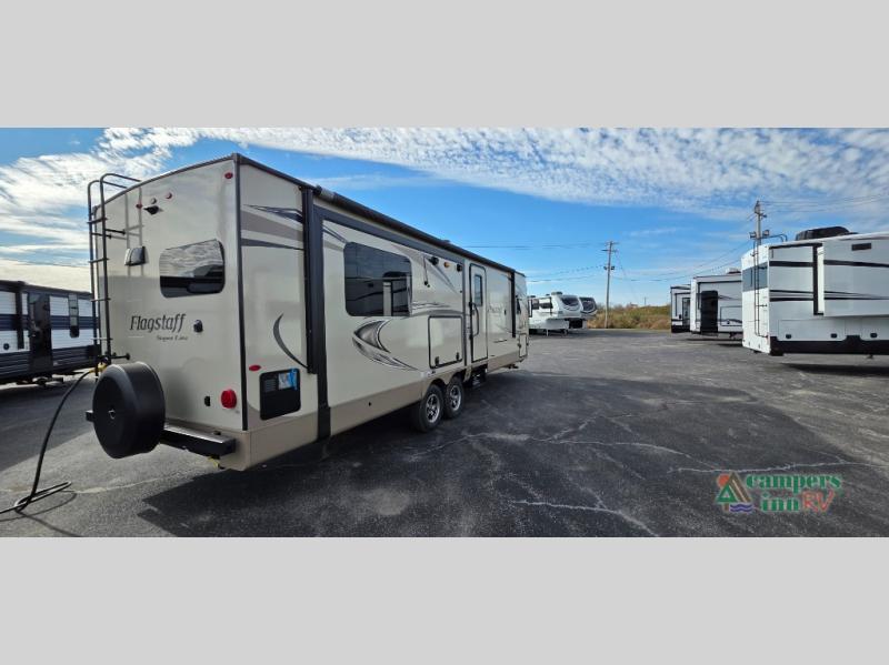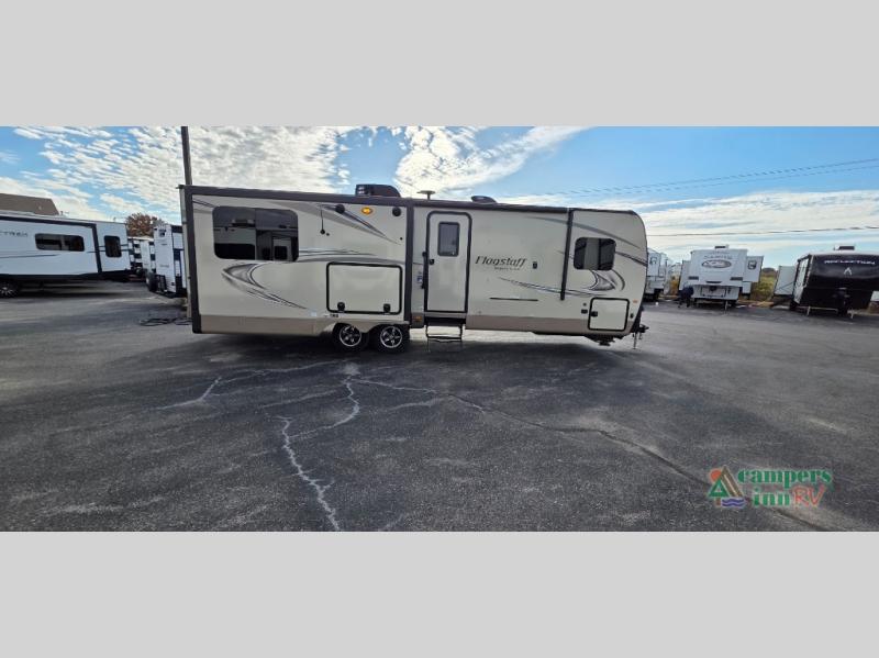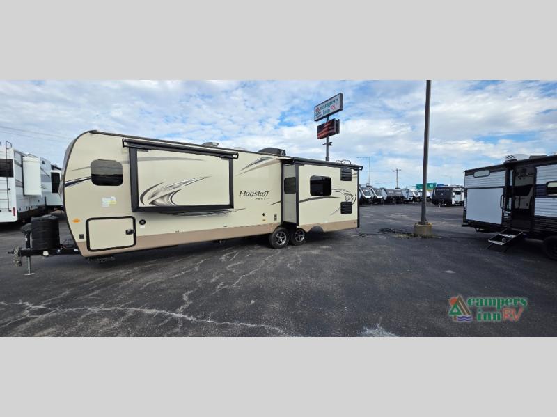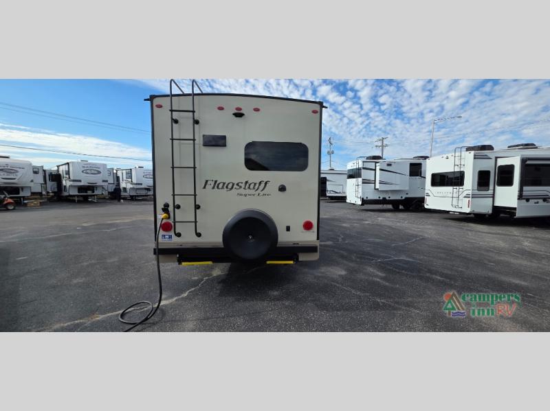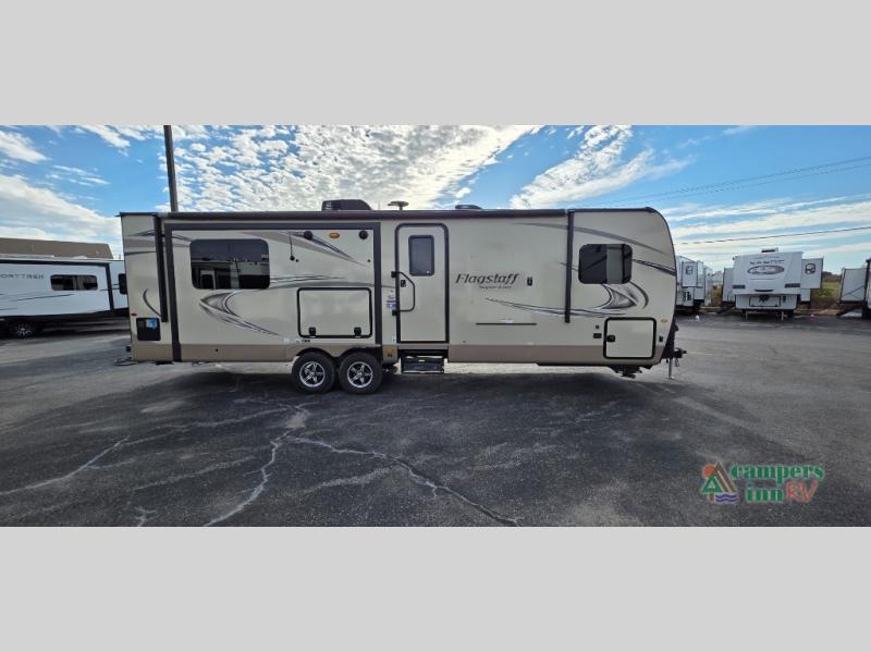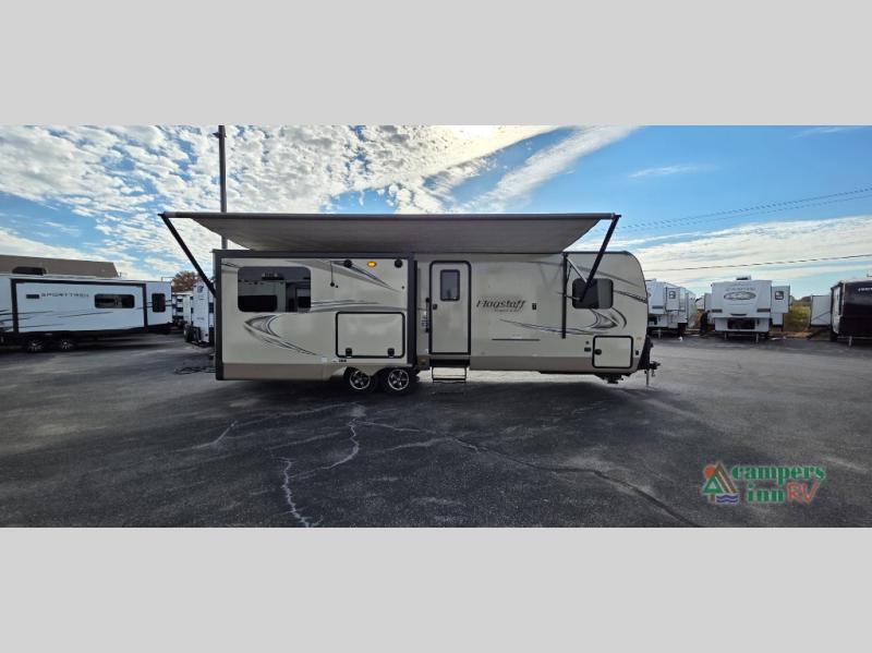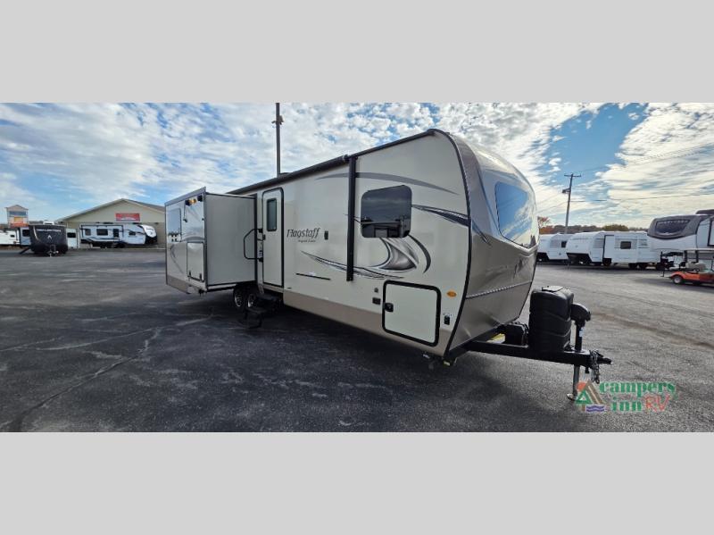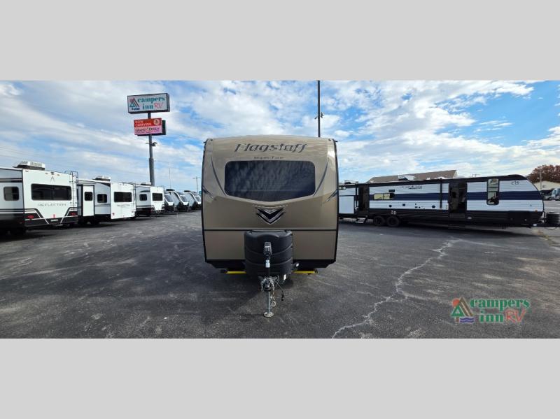 For any camping trip you will want a Flagstaff Super Lite travel trailer! These models have a beautiful Driftwood interior with solid wood and raised panel doors and drawers. You can rest comfortably in the living room at the heater theater seats with USB ports which come standard or are an optional choice per floorplan. Along the exterior there is a fully aluminum frame, radius roof with interior vaulted ceilings which gives you the most headroom, plus large dinette picture windows where you can sit and enjoy the view. The Standard Packages offer features such as a WiFi ranger WiFi booster, an enclosed underbelly, a power awning with adjustable rain dump and LED light strip, a rear observation camera prep with molded mounting plate, and so much more!