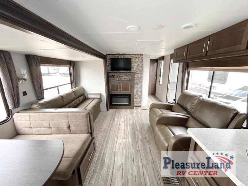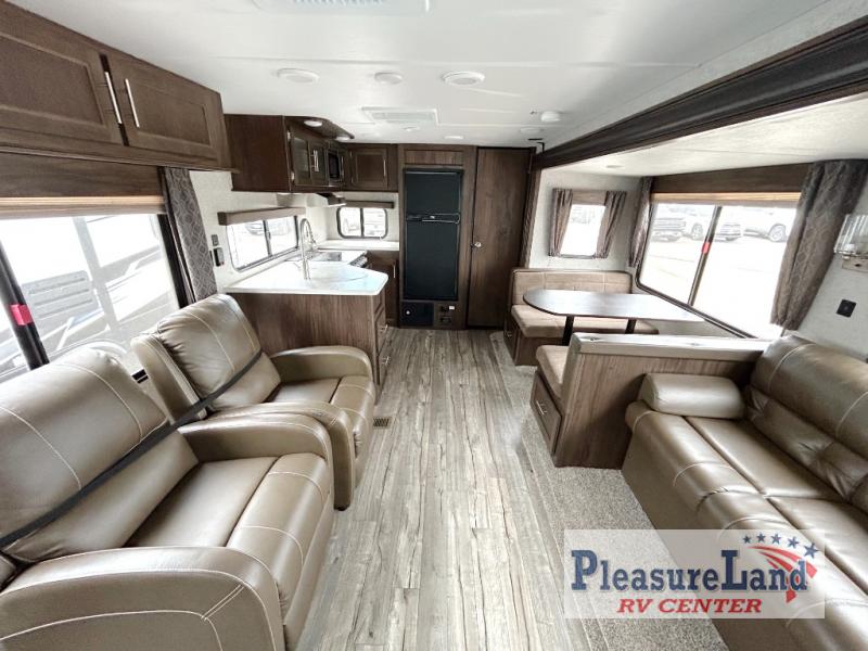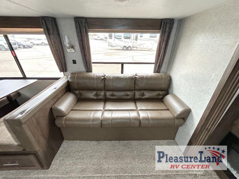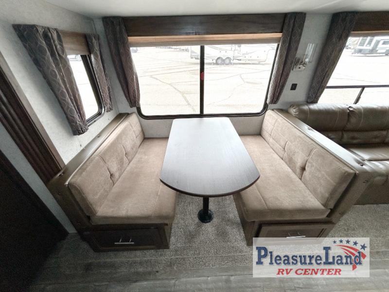 In the living area, there are two standard chairs just to the left of the entry door. An entertainment center and more linen storage are along the interior wall of the living space. The side opposite of the entry door includes a slide out. It has a sofa and a booth dinette.