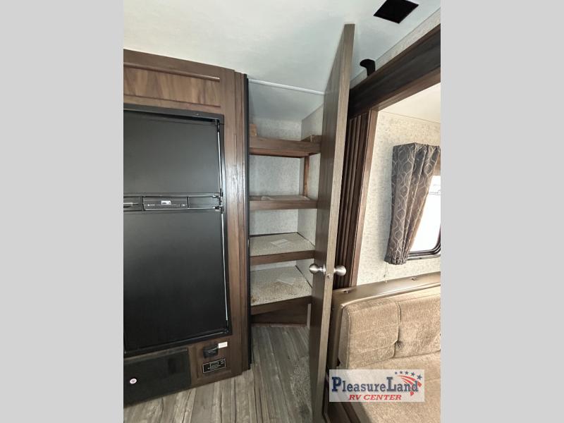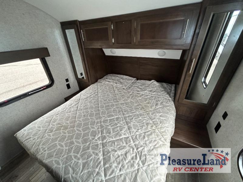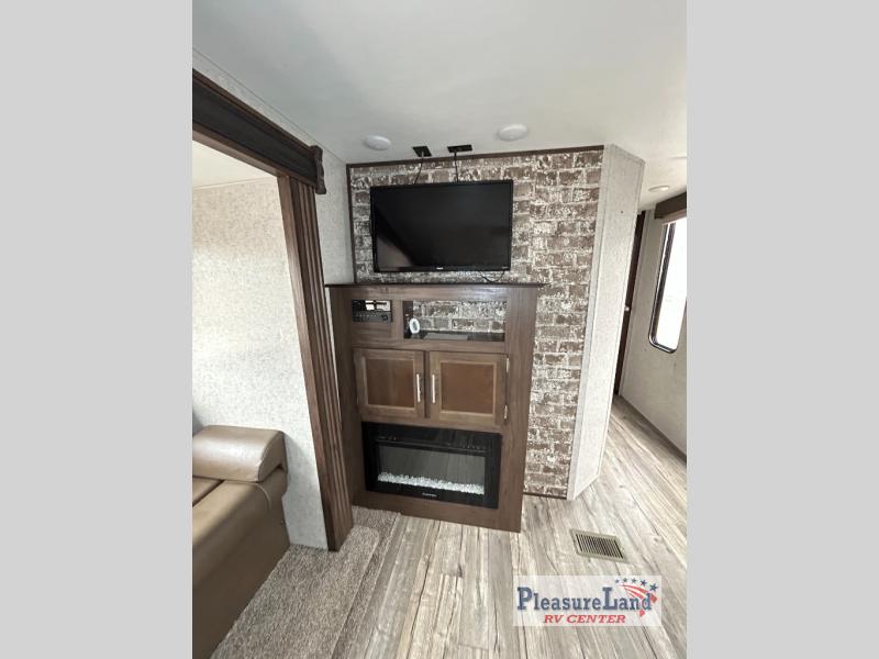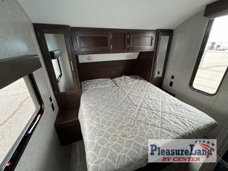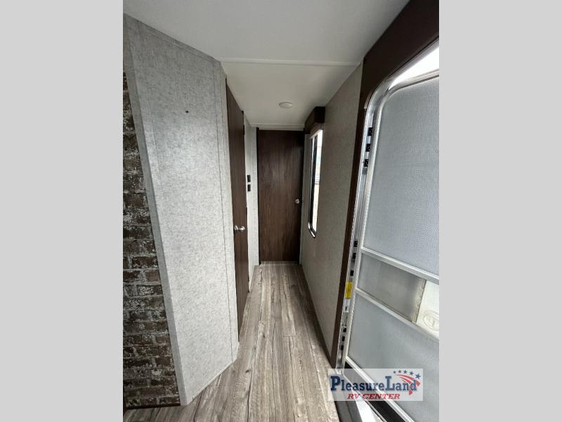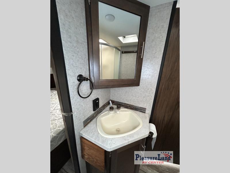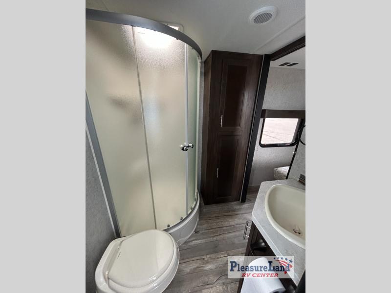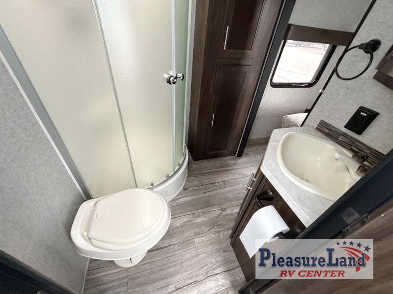 As you enter this travel trailer, a side aisle bathroom includes a toilet, corner shower, linen storage, and a corner vanity sink. It also includes a pocket door for entry to the bedroom.