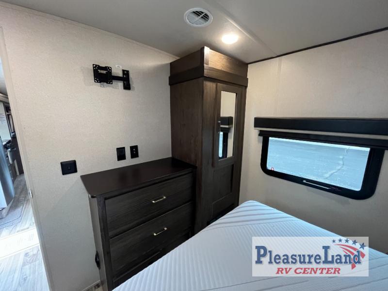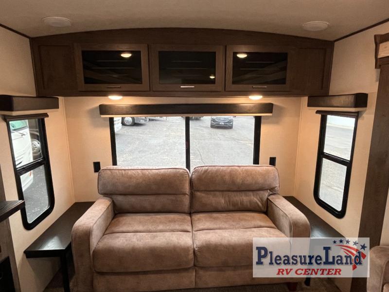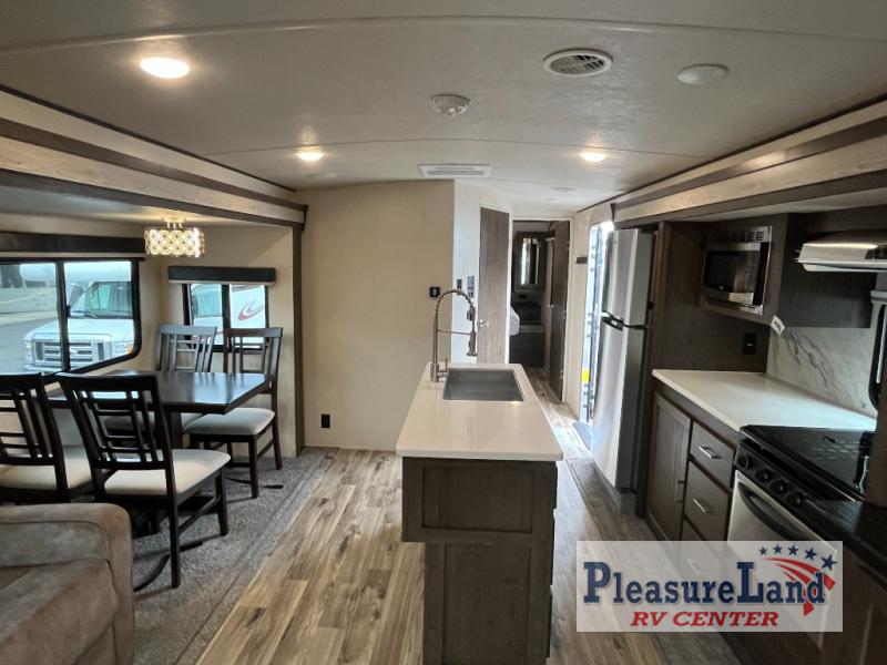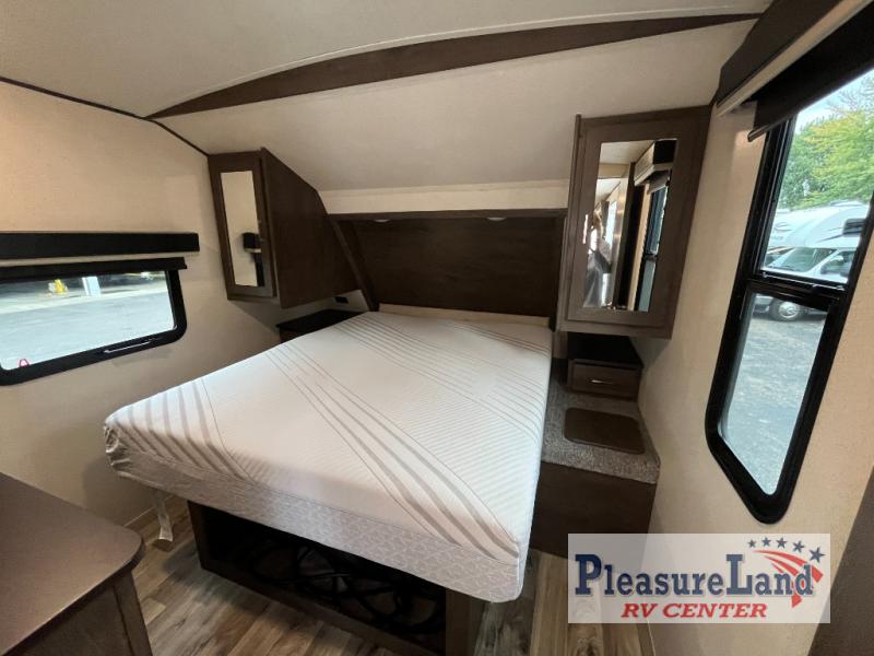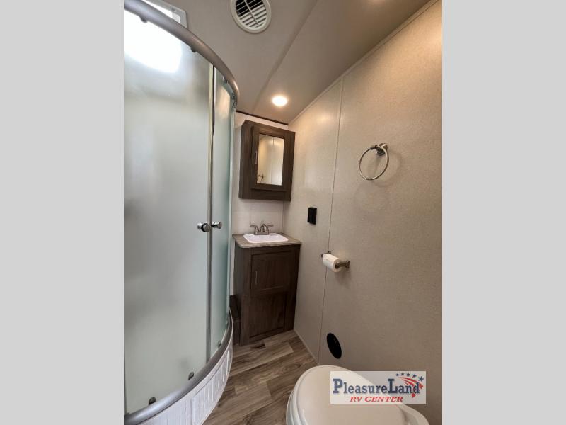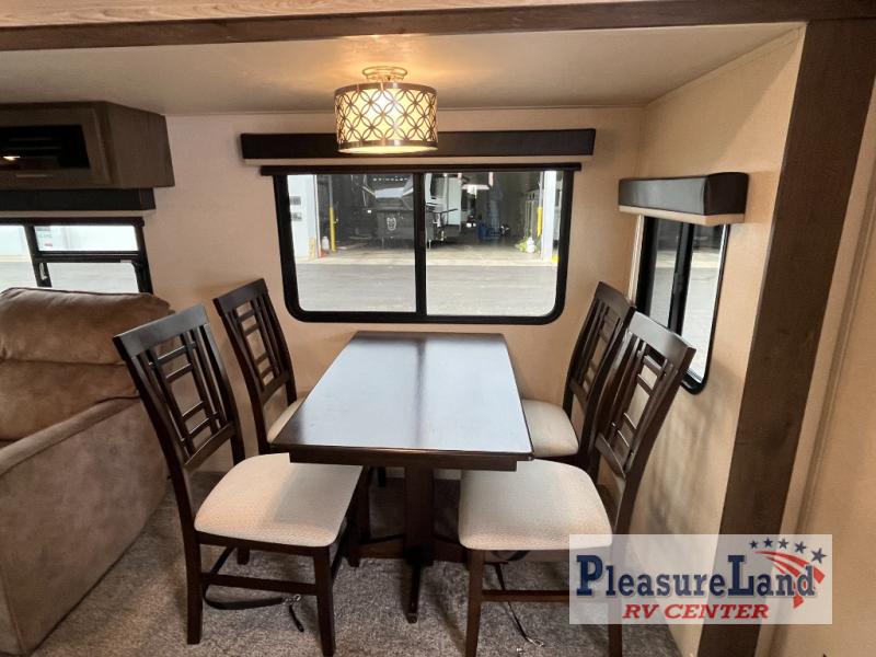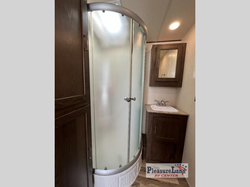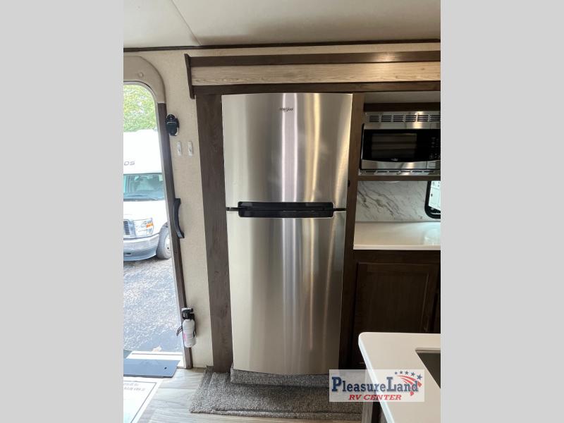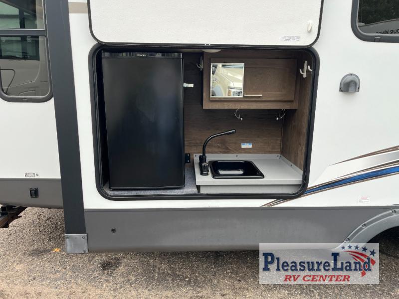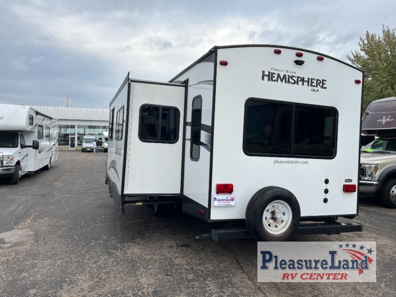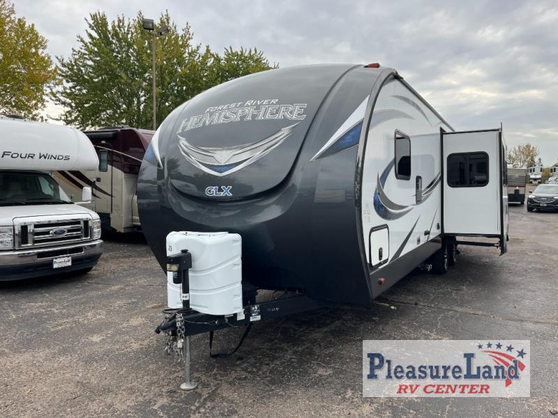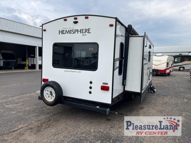 When you want time away from home, but yet want the comforts of home, then choose a Salem Hemisphere GLX travel trailer by Forest River. These models have plenty of residential features such as a stainless steel Dometic double door refrigerator, an under mount sink, stain resistant carpet in the living room and Beau plank wood linoleum in the kitchen. Along the exterior you will find an aerodynamic front cap with LED light strip, gel coated fiberglass exterior, and marine grade exterior speakers with a blue LED light. The One Touch electric awning provides plenty of shade and allows you to instantly have a nice outdoor living space and more!