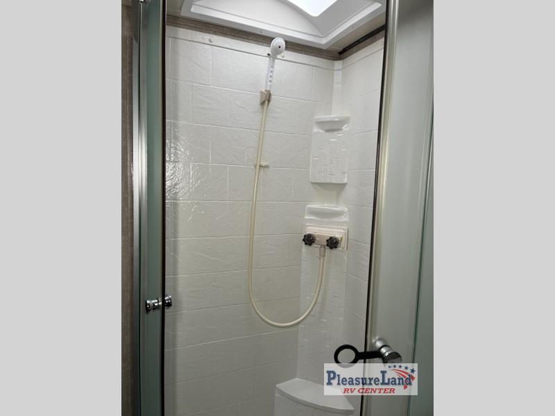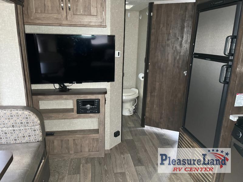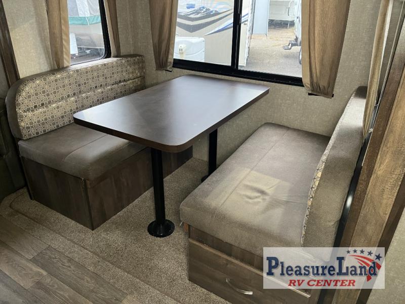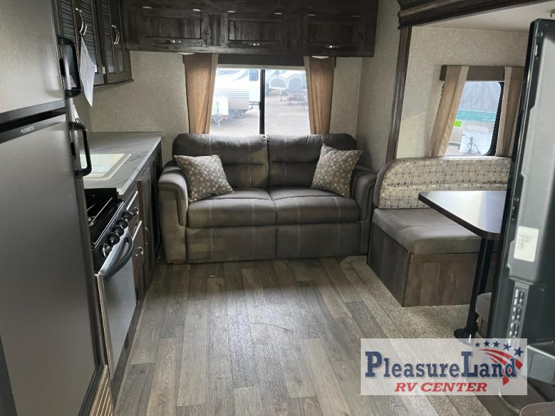 Along the rear of the trailer you can relax at the sofa, and at night it can convert into additional sleeping space. The dinette is on a slide, which helps to open up the floor space. Adjacent to the dinette you will find an entertainment center for your inside enjoyment.