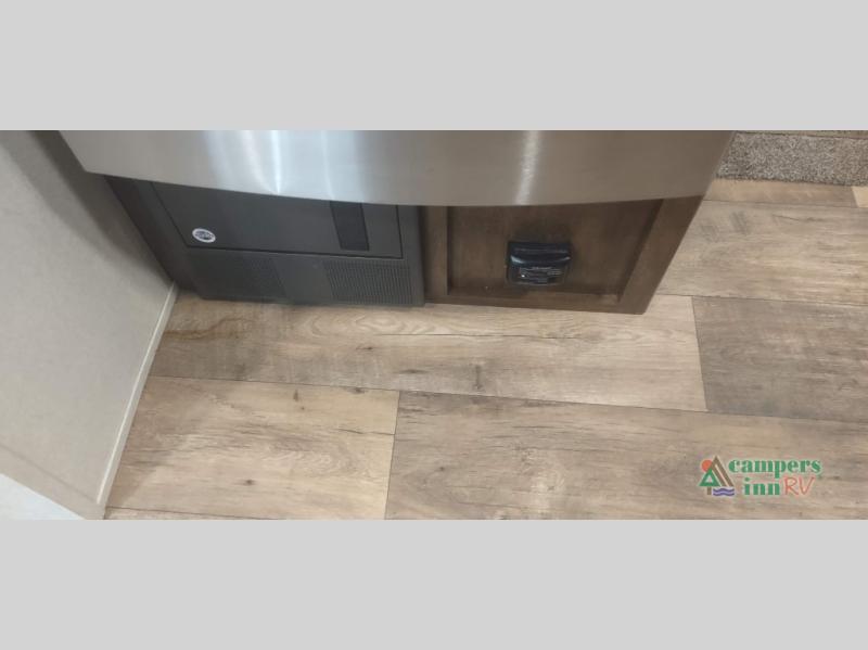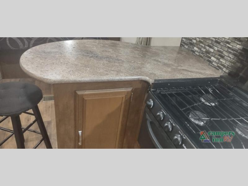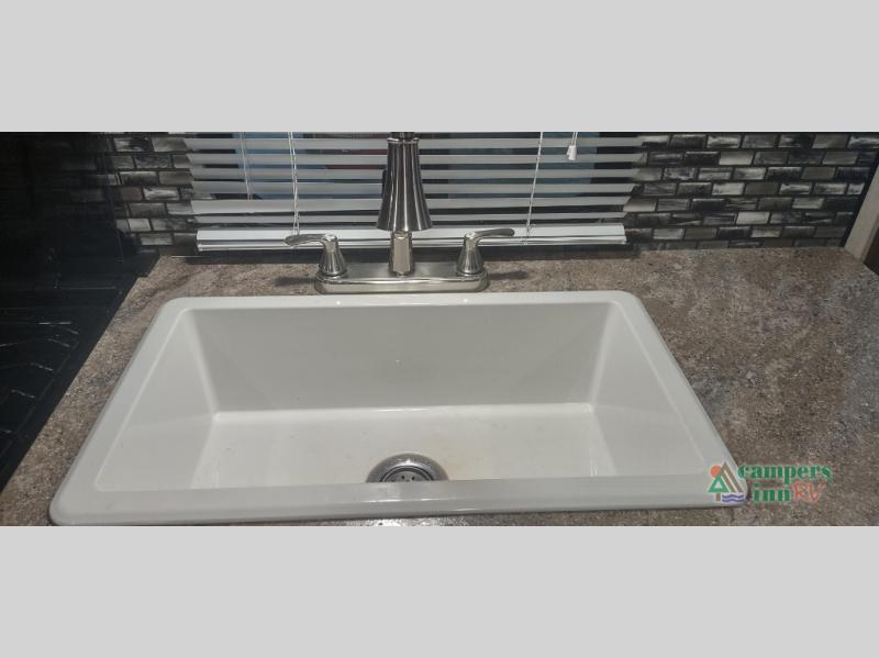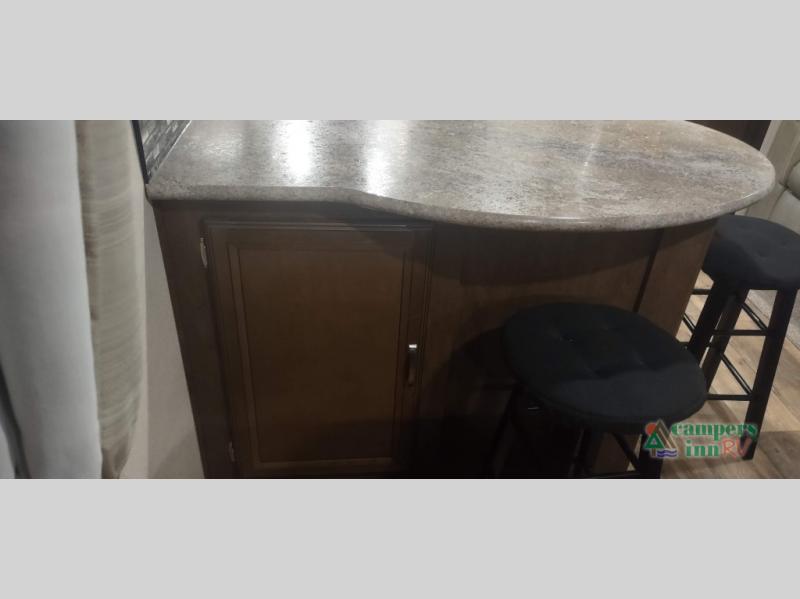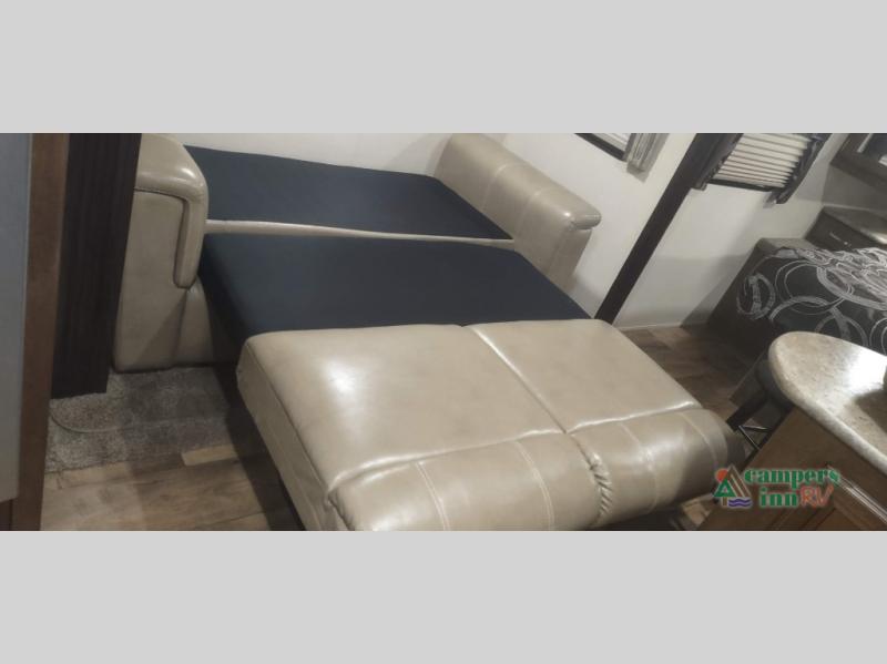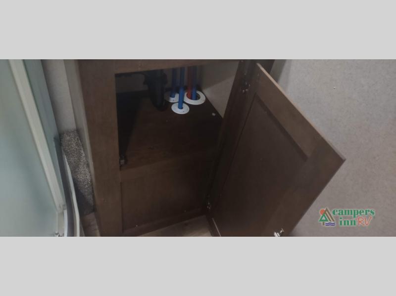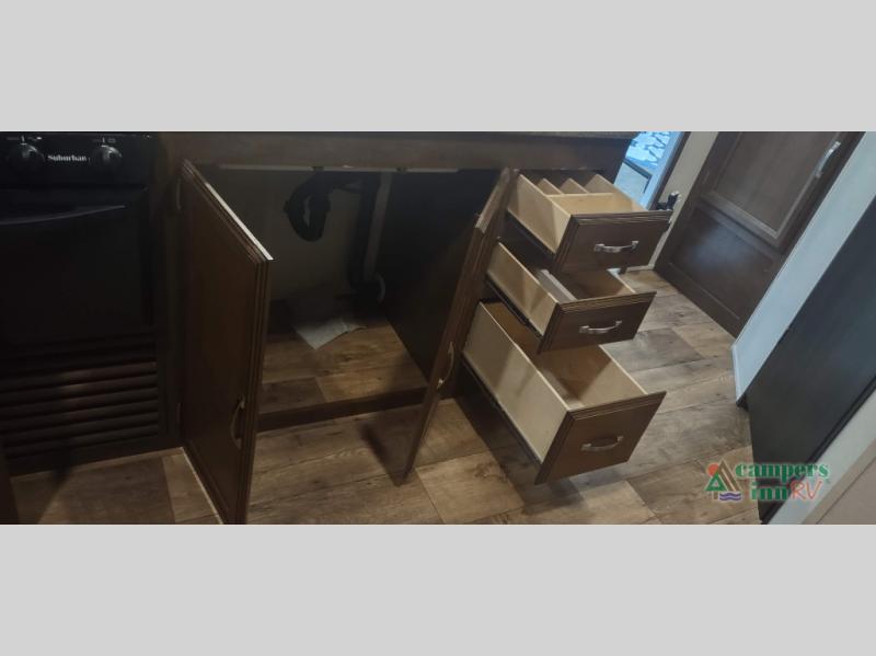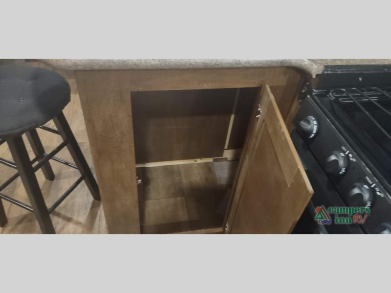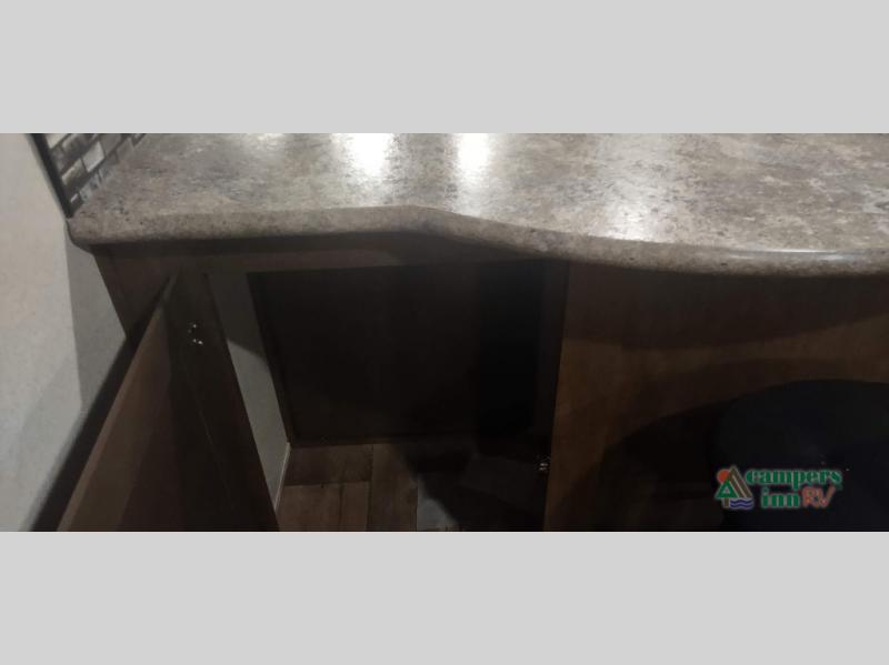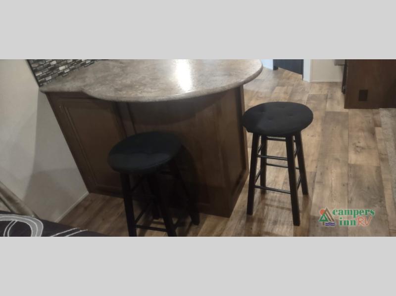 The centrally located kitchen features a Hyper-Lyte design that keeps things lightweight without sacrificing storage or prep space. Enjoy the residential feel of the high-rise faucet with pullout sprayer, premium appliances, and ample counter space—plus two bar stools where you can enjoy a quick breakfast or entertain inside on rainy days.