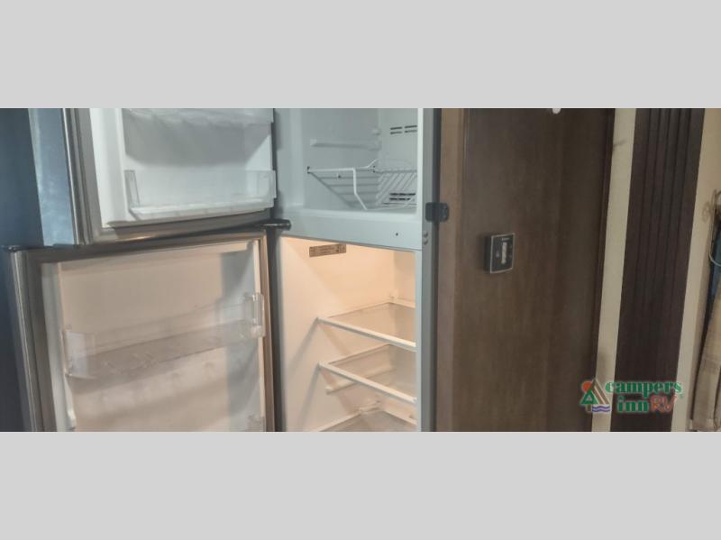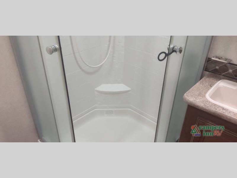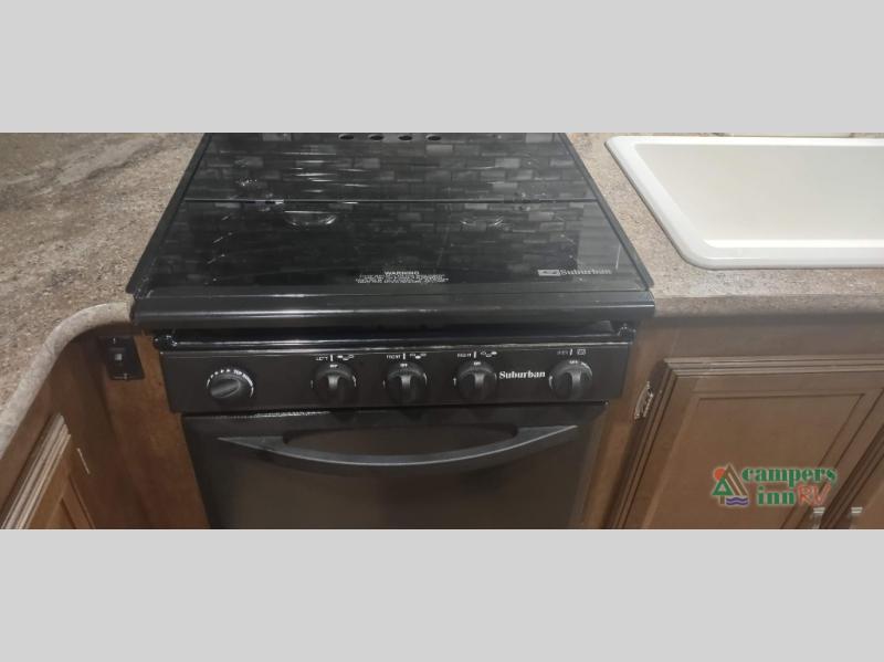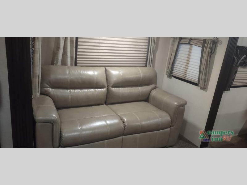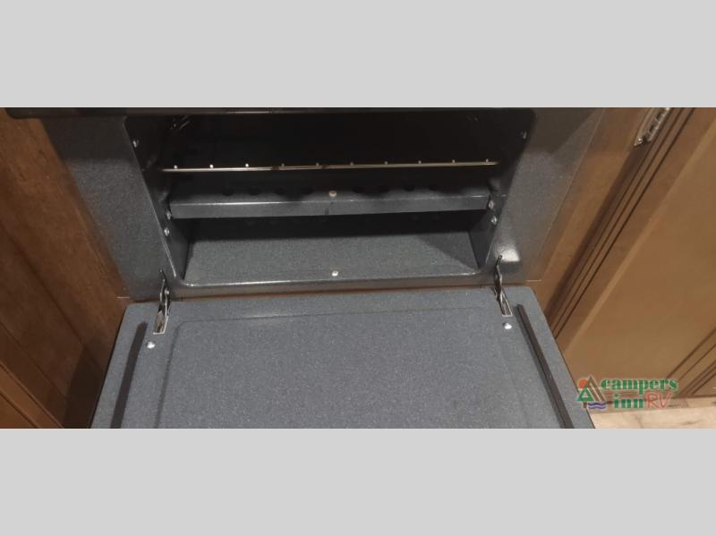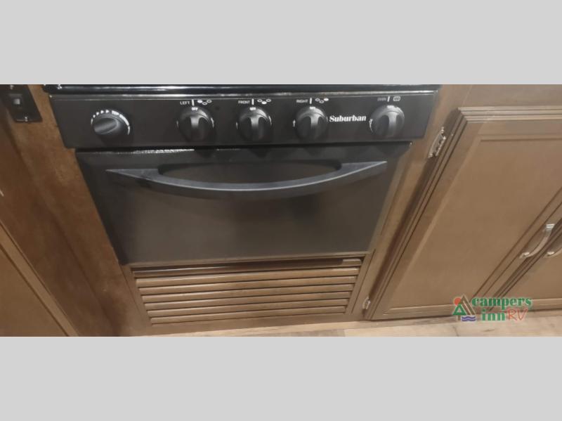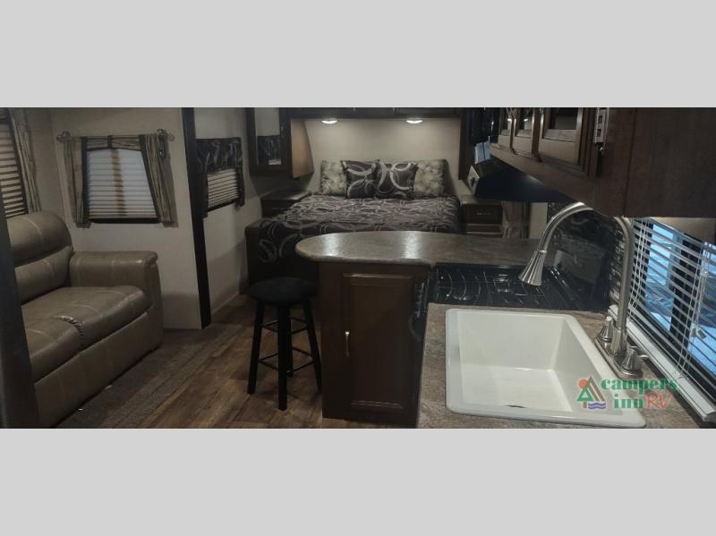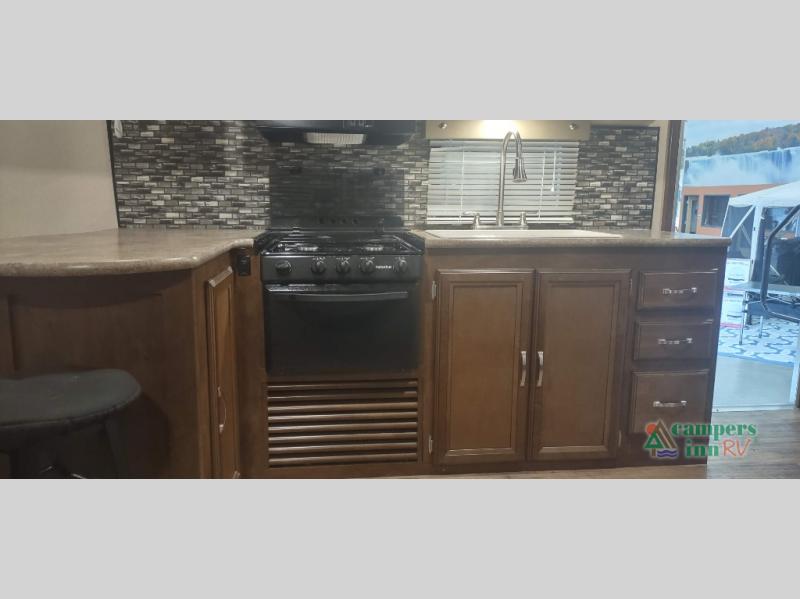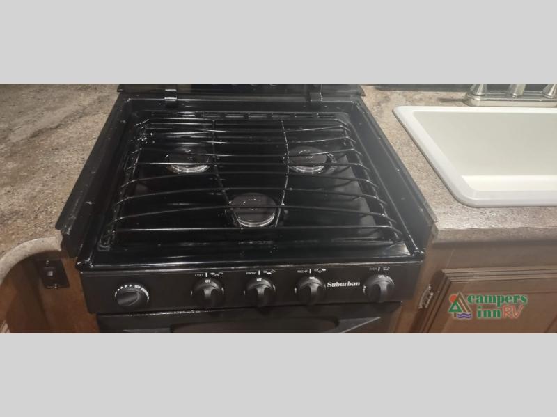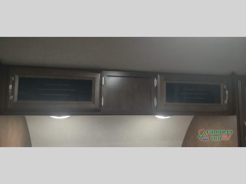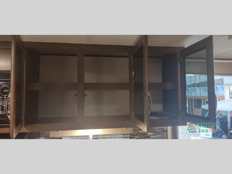 The centrally located kitchen features a Hyper-Lyte design that keeps things lightweight without sacrificing storage or prep space. Enjoy the residential feel of the high-rise faucet with pullout sprayer, premium appliances, and ample counter space—plus two bar stools where you can enjoy a quick breakfast or entertain inside on rainy days.