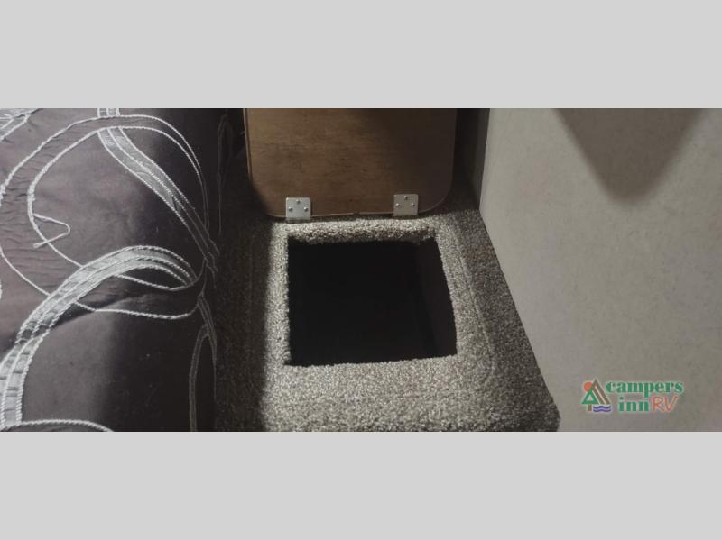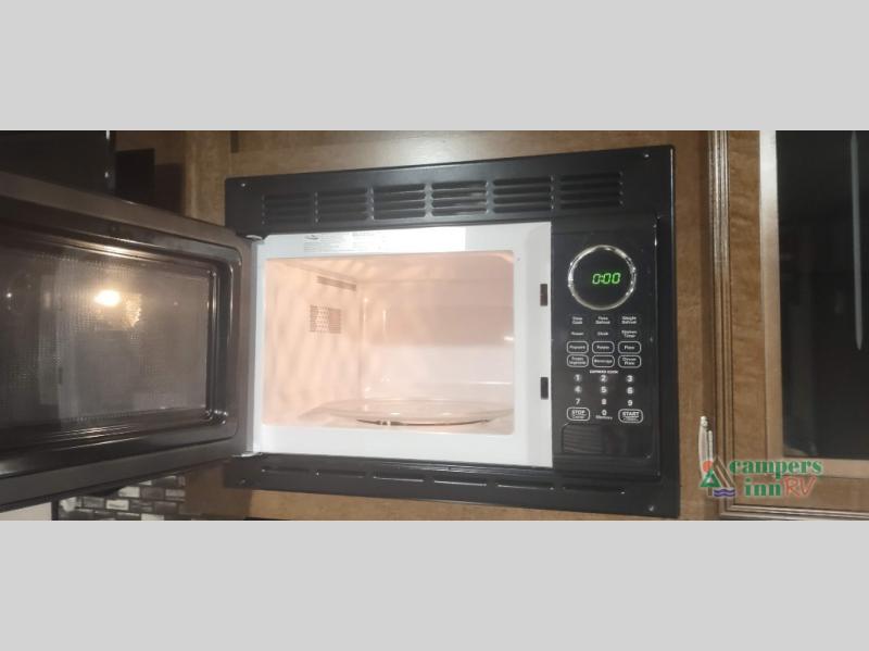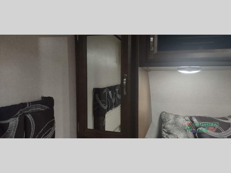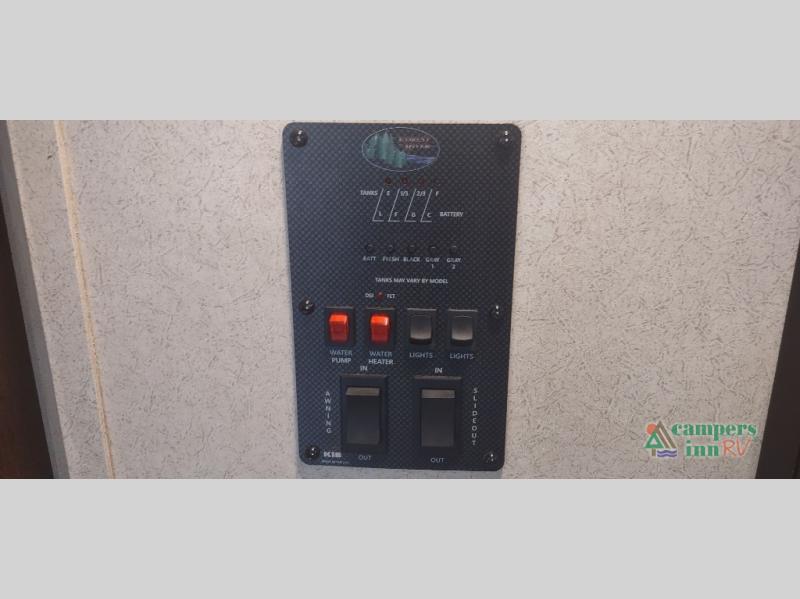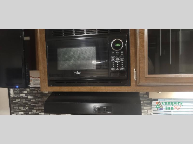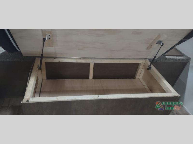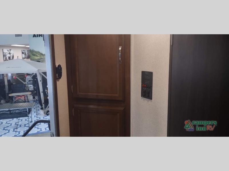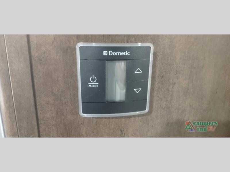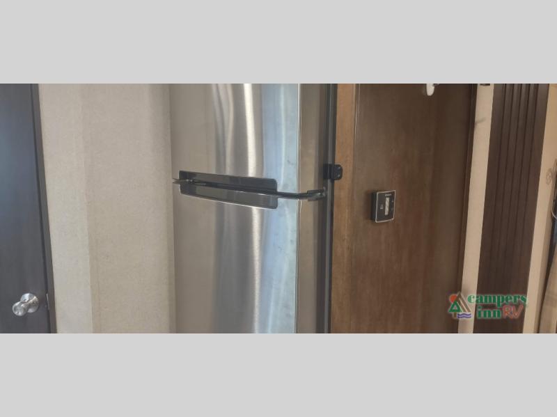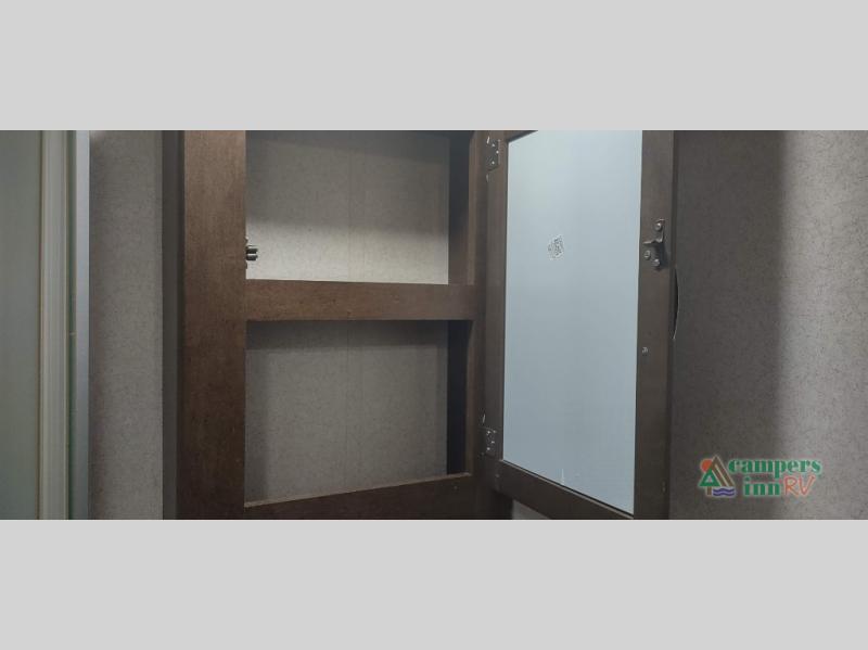 The centrally located kitchen features a Hyper-Lyte design that keeps things lightweight without sacrificing storage or prep space. Enjoy the residential feel of the high-rise faucet with pullout sprayer, premium appliances, and ample counter space—plus two bar stools where you can enjoy a quick breakfast or entertain inside on rainy days.